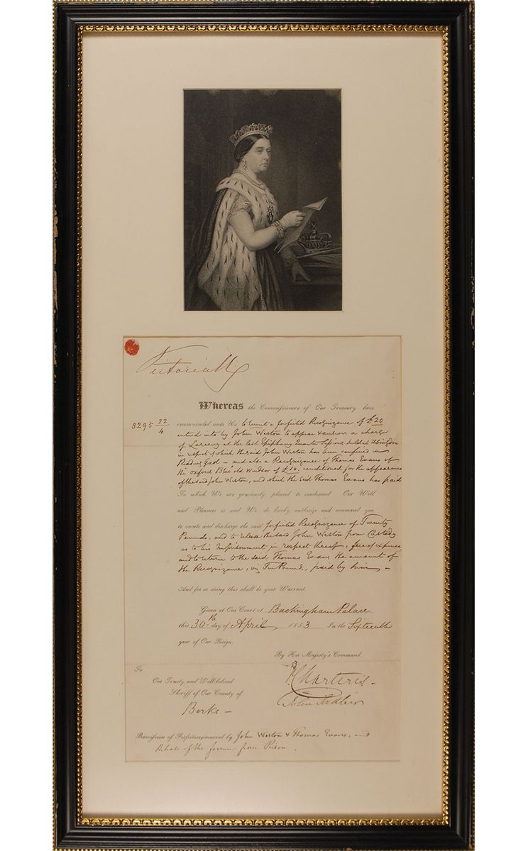 Partly-printed DS, signed “Victoria R,” one page, 9 x 14, April 30, 1853. Document regarding the release of a prisoner suspected of larceny and return of bail money, summarized at the conclusion: “Remission of Forfeitures incurred by John Weston & Thomas Evans, and Release of the former from Prison.” Matted with a portrait of Victoria and framed to an overall size of 14 x 28. In fine condition. Oversized.