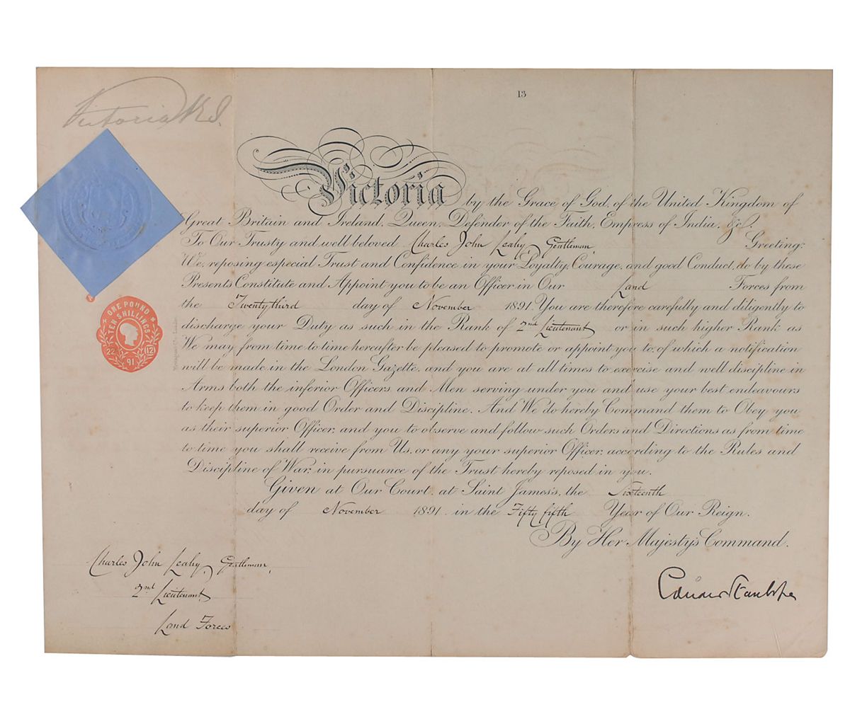 Partly-printed DS, signed “Victoria R,” one page, 16 x 12, November 16, 1891. Queen Victoria appoints Charles John Leahy as “an Officer in Our Land Forces…in the Rank of 2nd Lieutenant.” Signed in the upper left by Victoria and countersigned at the conclusion by Edward Stanhope. Blue paper seal affixed to the upper left remains fully intact. In very good condition, with three heavy vertical storage folds and scattered foxing.