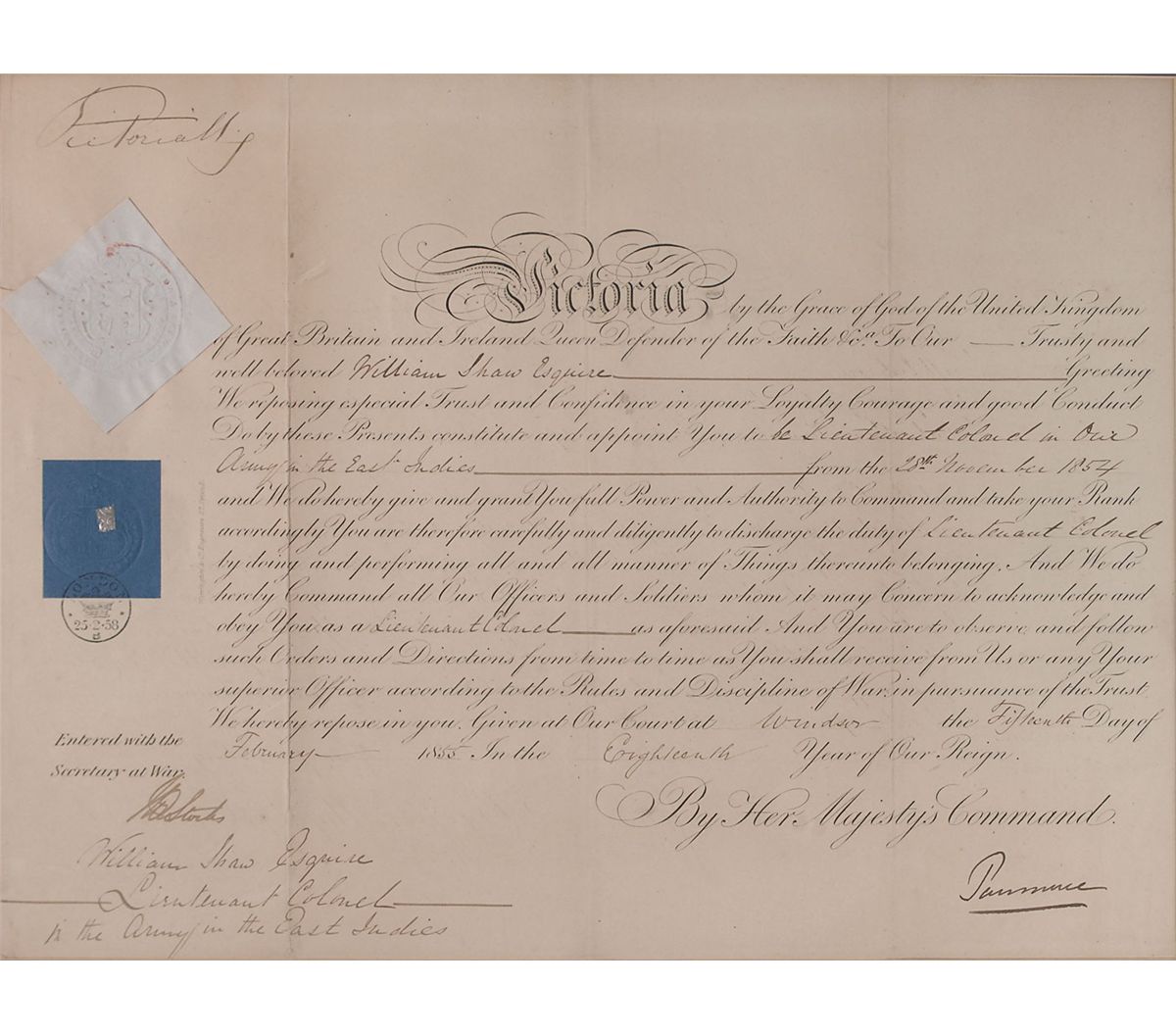 Partly-printed DS, signed “Victoria R,” one page, 15.75 x 11.75, February 15, 1855. Queen Victoria appoints William Shaw as a “Lieutenant Colonel in Our Army in the East Indies.” Signed in the upper left by Victoria and countersigned at the conclusion by Lord Panmure. Paper seal affixed to upper left remains crisp and fully intact. Double-matted to an overall size of 20.25 x 16.25. In fine condition, with three vertical storage folds.