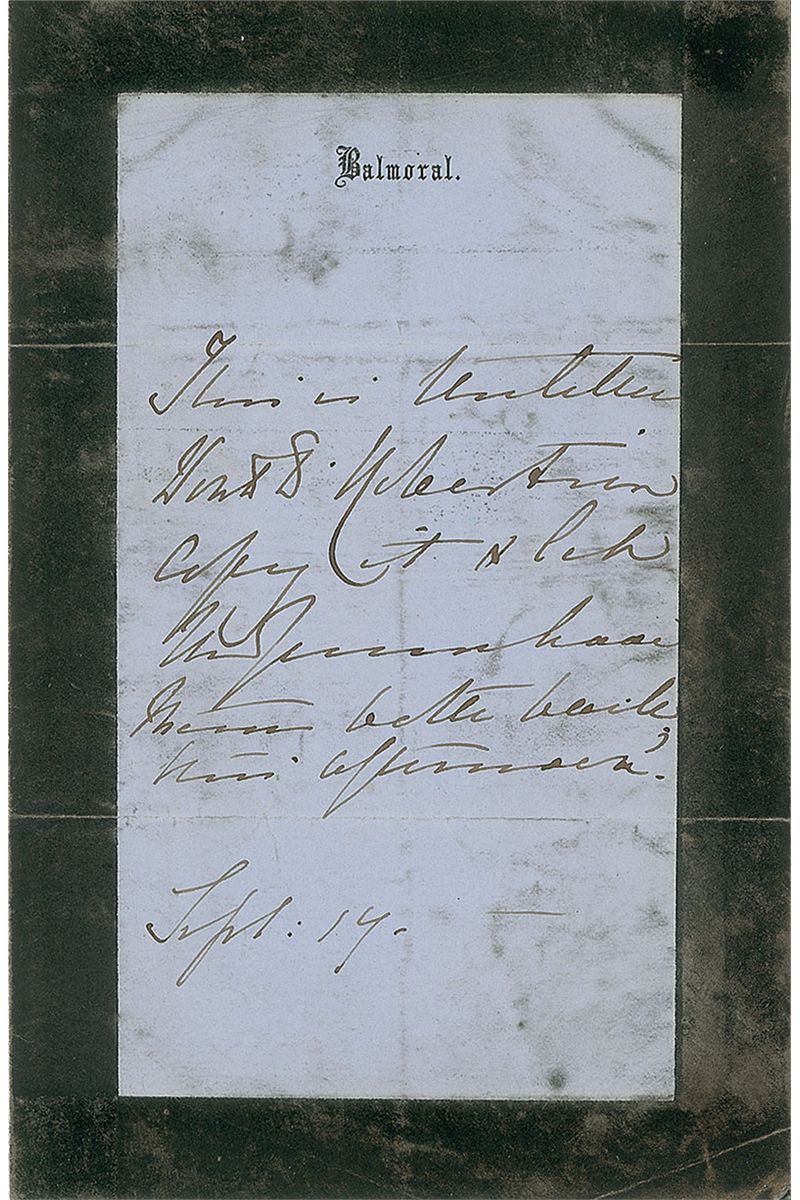 Third-person ALS, one page, 4.5 x 7, black-bordered Balmoral letterhead, September 14. Brief letter to an unidentified recipient in the Queen’s difficult to decipher hand, referring to herself as “the Queen.” In very good condition, with intersecting folds and scattered soiling, not affecting the legibility of the text.