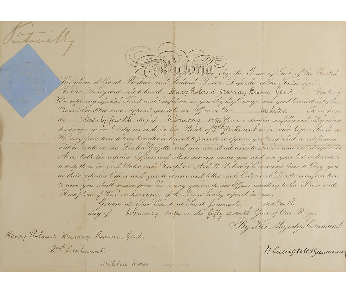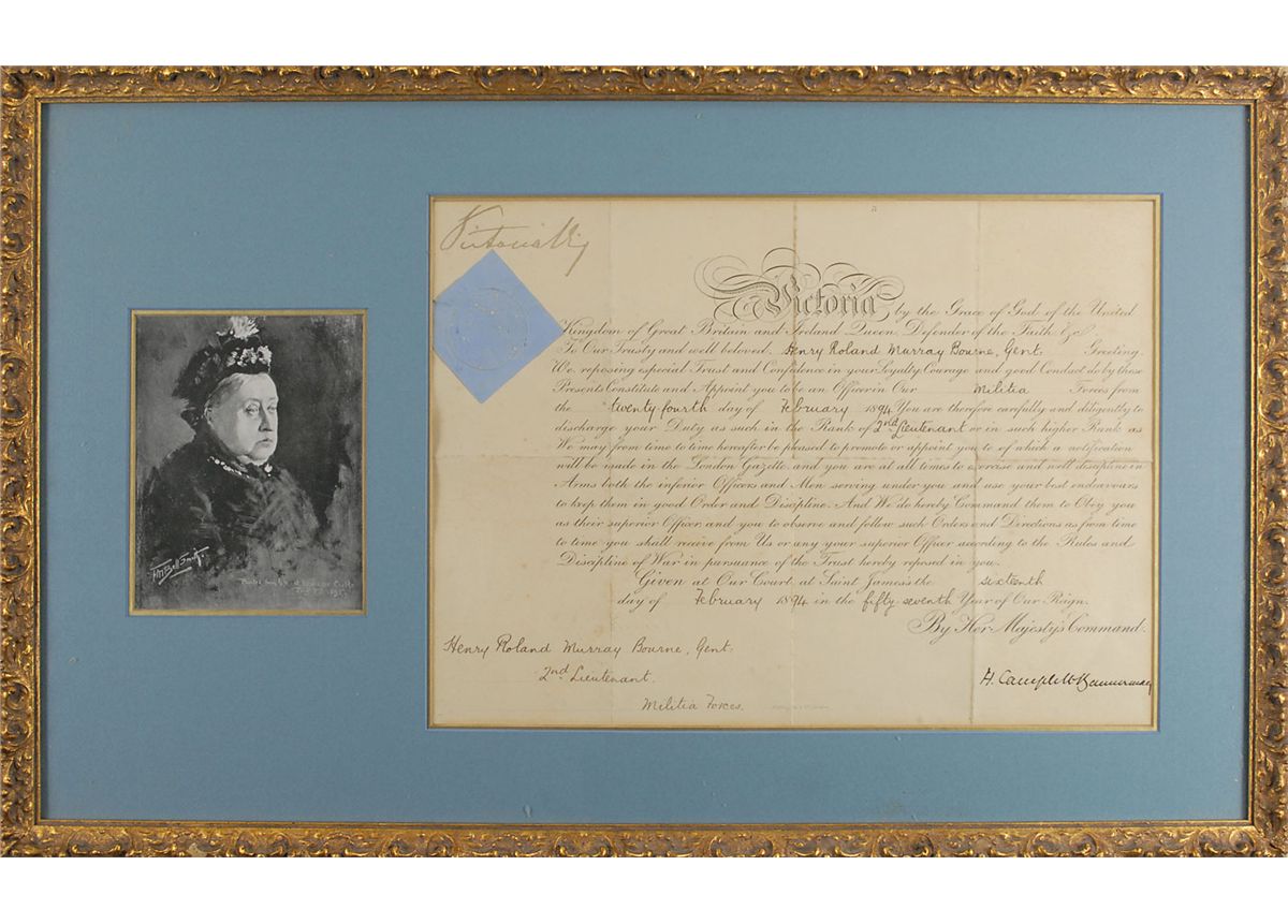 Partly-printed DS, signed “Victoria R,” one page, 15.75 x 11.5, February 16, 1894. The Queen appoints Roland Murray Bourne “to be an Officer in Our Militia Forces…You are therefore carefully and diligently to discharge your Duty as such in the Rank of 2nd Lieutenant.” Signed above the blue paper seal by Victoria. Double-matted and framed with a portrait of Victoria to an overall size of 28 x 17.25. Some repaired separations to a couple of the intersecting folds, and a uniform shade of overall toning, with a few slightly heavier spots, otherwise fine condition. The blue paper seal is only slightly worn and toned and remains intact. Oversized.