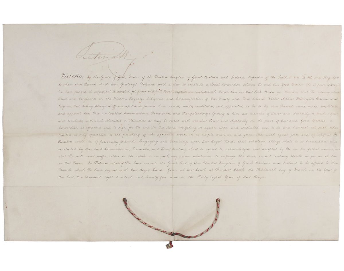 Partly-printed DS, signed “Victoria R,” one page, 20.5 x 13.25, March 13, 1875. The Queen, “with a view to conclude a Postal Convention between Us and our good brother the Emperor of Brazil,” appoints “Victor Arthur Wellington Drummond Esquire, Our Acting Charge d’Affaires at Rio de Janeiro…and appoint him Our undoubted Commissioner Procurator.” Signed along the top by Victoria. In fine condition, with intersecting folds, one through a single letter of signature, and a bit of scattered light foxing around signature. Document retains its original red and silver braided chord. Drummond held several notable posts throughout his life, including Secretary of the Embassy in Vienna; Minister Resident to Kings of Bavaria and Wurttemberg; and Secretary to British Legation in Washington, DC.