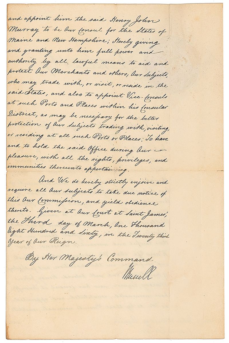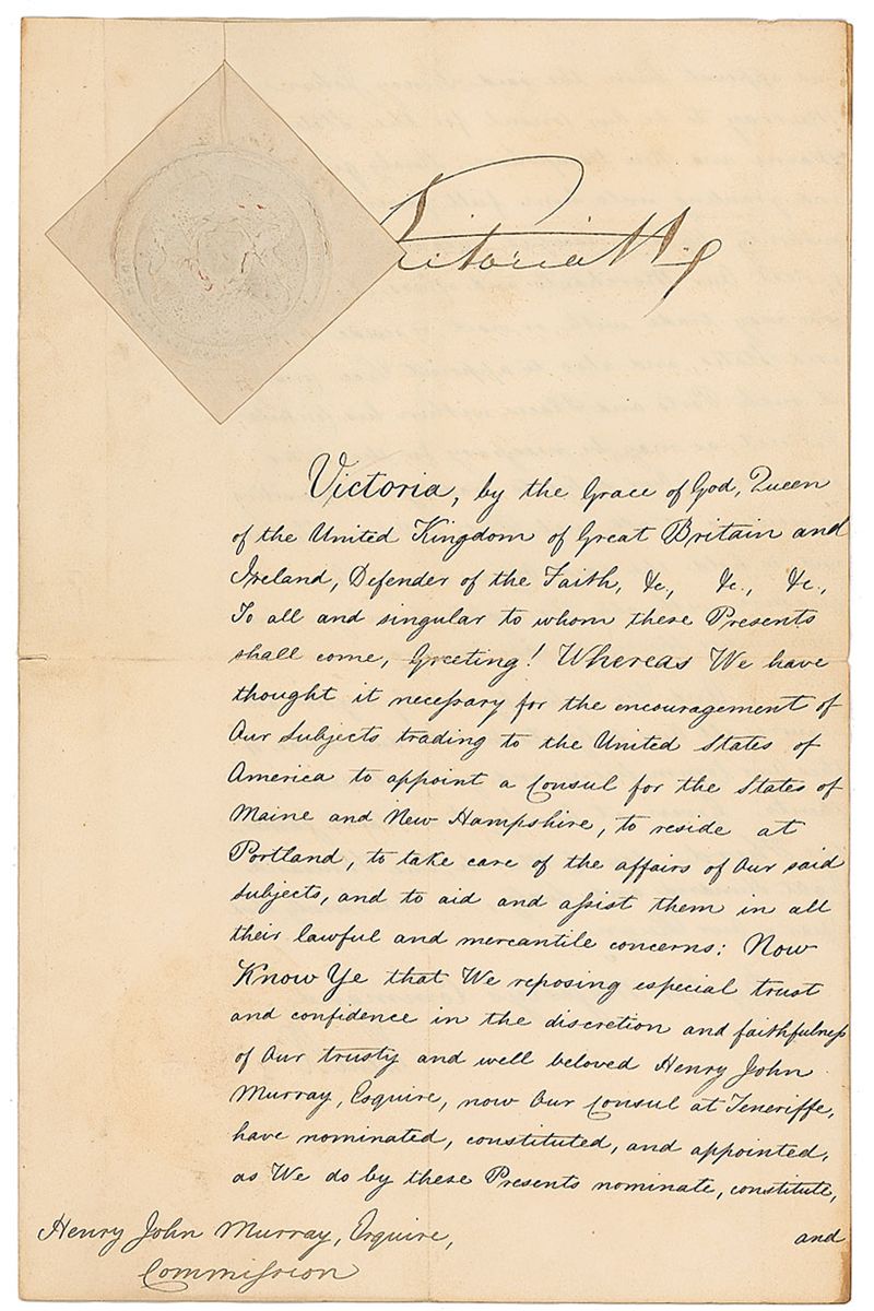 Manuscript DS, signed “Victoria R,” one page both sides, 9.5 x 14.5, March 3, 1860. Queen Victoria appoints a diplomat to the United States. In part: “Whereas we have thought it necessary for the encouragement of our subjects trading to the United States of America to appoint a consul for the states of Maine and New Hampshire, to reside at Portland, to take care of the affairs of our said subjects, and to aid and assist them in all mercantile concerns…We do…appoint him the said Henry John Murray to our consul for the states of Maine and New Hampshire.” Nicely signed at the top by Victoria and countersigned at the conclusion by Lord John Russell as secretary of state for foreign affairs. The white embossed paper seal affixed to the top remains crisp and fully intact. In fine condition, with intersecting folds with a small split at the center and small separation to left edge. A remarkably bold document signed by two of Britain’s most influential 19th-century leaders.