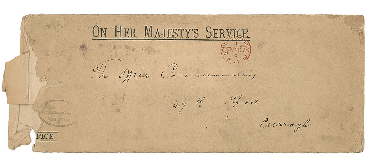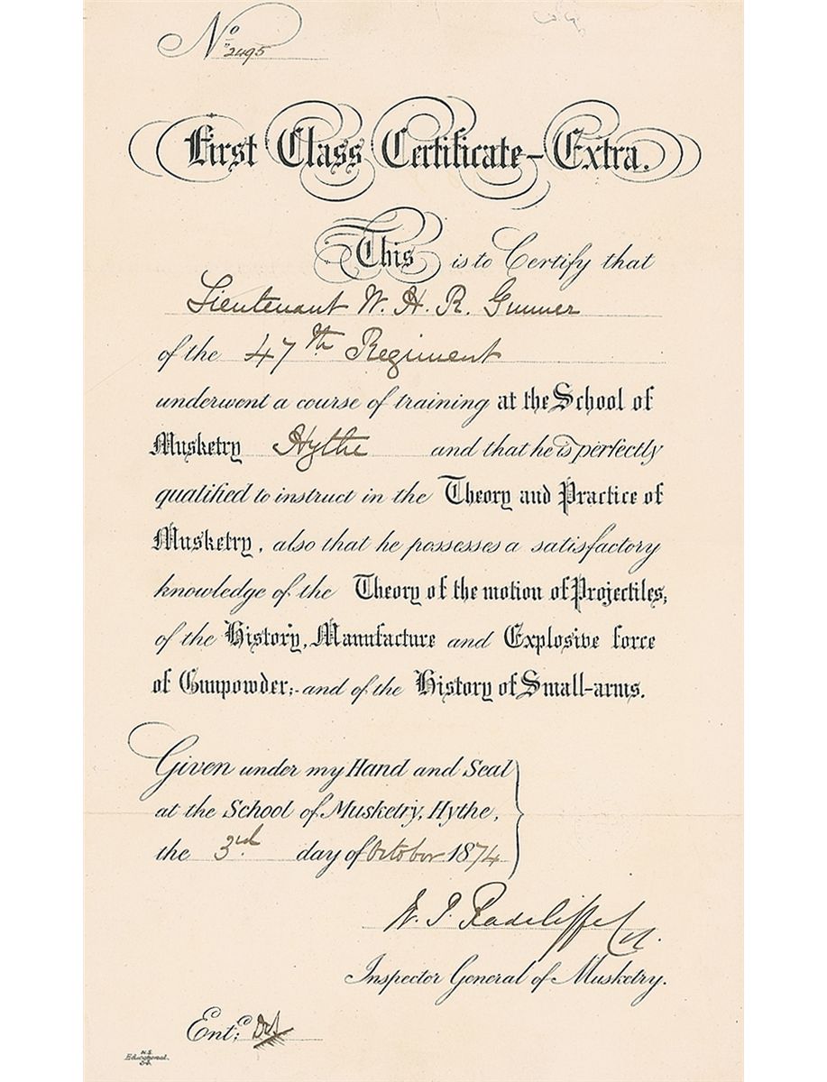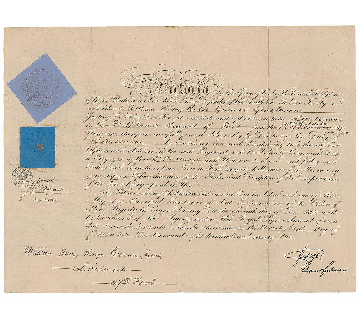 Partly-printed DS, signed “Victoria R,” one page, 15.75 x 12, November 12, 1870. Queen Victoria appoints William Henry Ridge Gunner as “an Officer in Our Infantry…in the rank of Ensign.” Signed in the upper left by the Queen above the affixed blue seals. Three worn vertical folds, a few light stains, and expected document wear, otherwise fine condition. Accompanied by official documents, not signed by Victoria, including an 1871 document promoting Gunner to lieutenant and an 1878 document promoting him to captain, as well as a musketry training certificate, examination certificate, and mailing envelope.