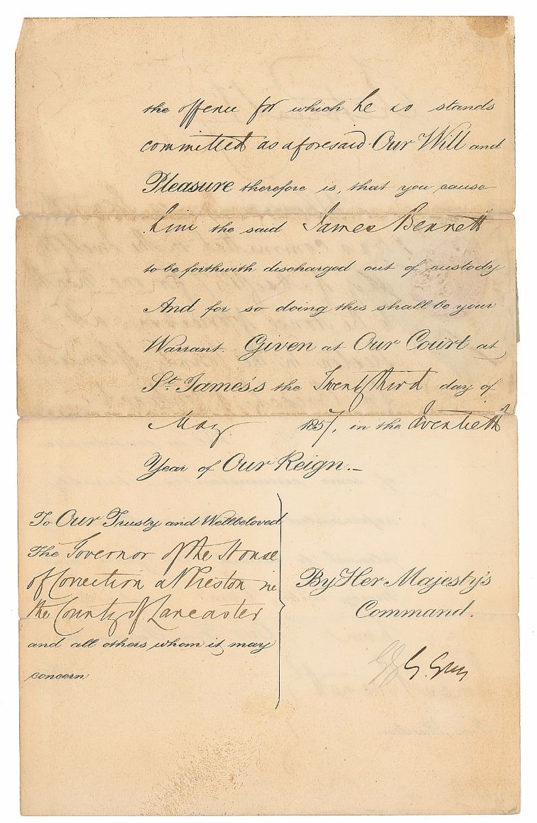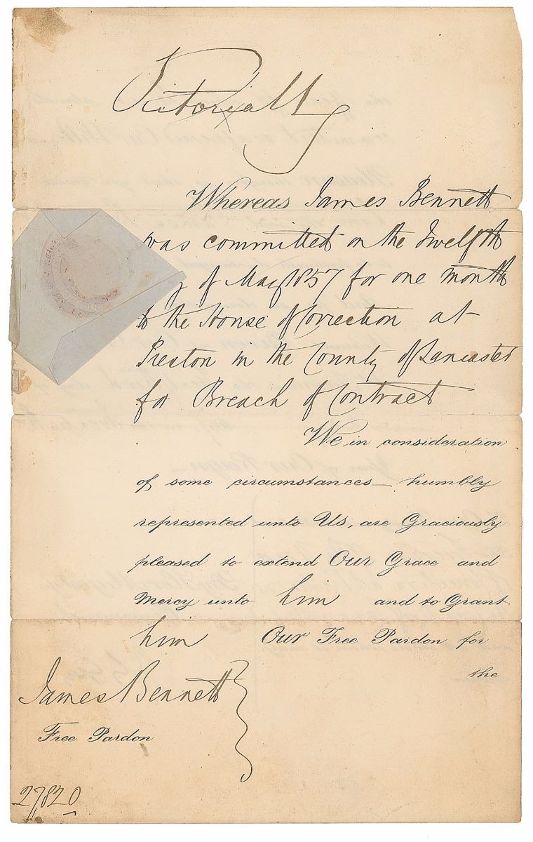 Manuscript DS, signed “Victoria R,” one page both sides, 8 x 12.75, May 23, 1857. Queen Victoria issues a pardon, in part: “Whereas James Bennett was committed on the twelfth day of May 1857 for one month to the House of Correction at Preston…for Breach of Contract, We in consideration of some circumstances humbly represented unto Us, are Graciously pleased to extend Our Grace and Mercy unto him Our Free Pardon.” Signed at the top by Queen Victoria. The paper seal affixed in the left margin remains partially intact with one missing corner. In very good condition, with small repaired edge separations to horizontal folds, light soiling, and irregular toning to edges. Accompanied by a mat for display and a copy of a letter of authenticity from PSA/DNA.
