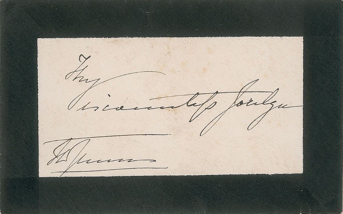Black-bordered 4.5 x 2.75 envelope addressed in Queen Victoria’s hand to “The Viscountess Jocelyn,” and signed in the lower left, “The Queen.” Affixed to a larger card. In fine condition. Frances Jocelyn, Viscountess Jocelyn, was one of the trainbearers at the coronation of Queen Victoria and also served as a bridesmaid at her royal wedding in 1840.