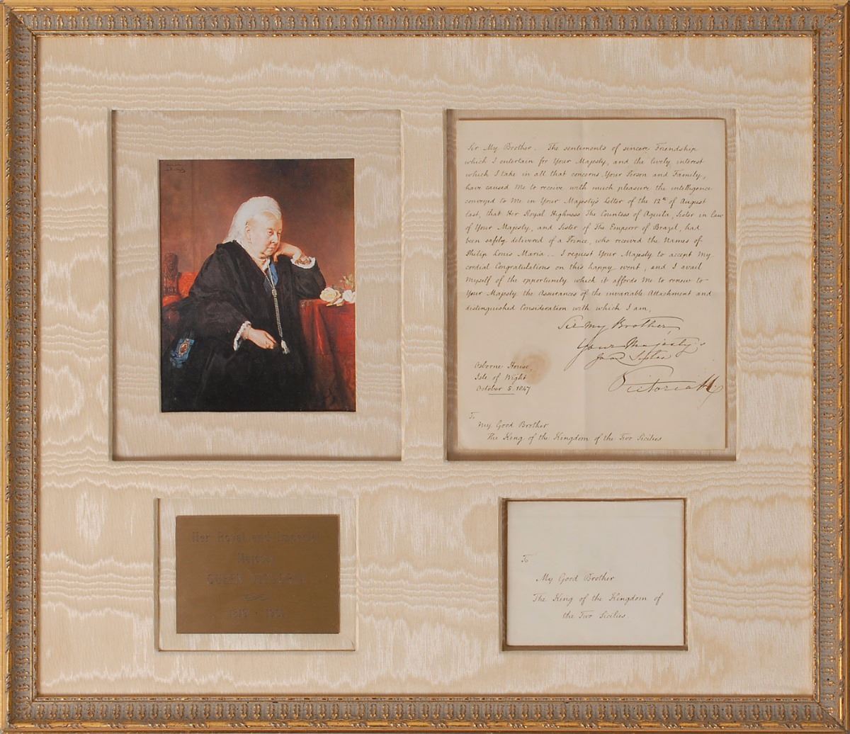 LS signed “Victoria R,” one page, 7.5 x 9, October 5, 1847. Letter to “My Good Brothers, The King of the Kingdom of the Two Sicilies.” In part: “The sentiments of sincere Friendship which I entertain for Your Majesty…have caused me to receive with much pleasure the intelligence conveyed…that Her Royal Highness The Countess of Aquila, Sister in law of Your Majesty, and Sister of The Emperor of Brazil, had been safely delivered of a Prince, who received the names of Philip Louis Maria.—I request Your Majesty to accept my cordial Congratulations on this happy event.” Beautifully mounted, cloth-matted, and framed with a portrait, plaque, and the original transmittal envelope. In fine condition, with a circular seal-related stain. A fantastic piece of correspondence between monarchs.
