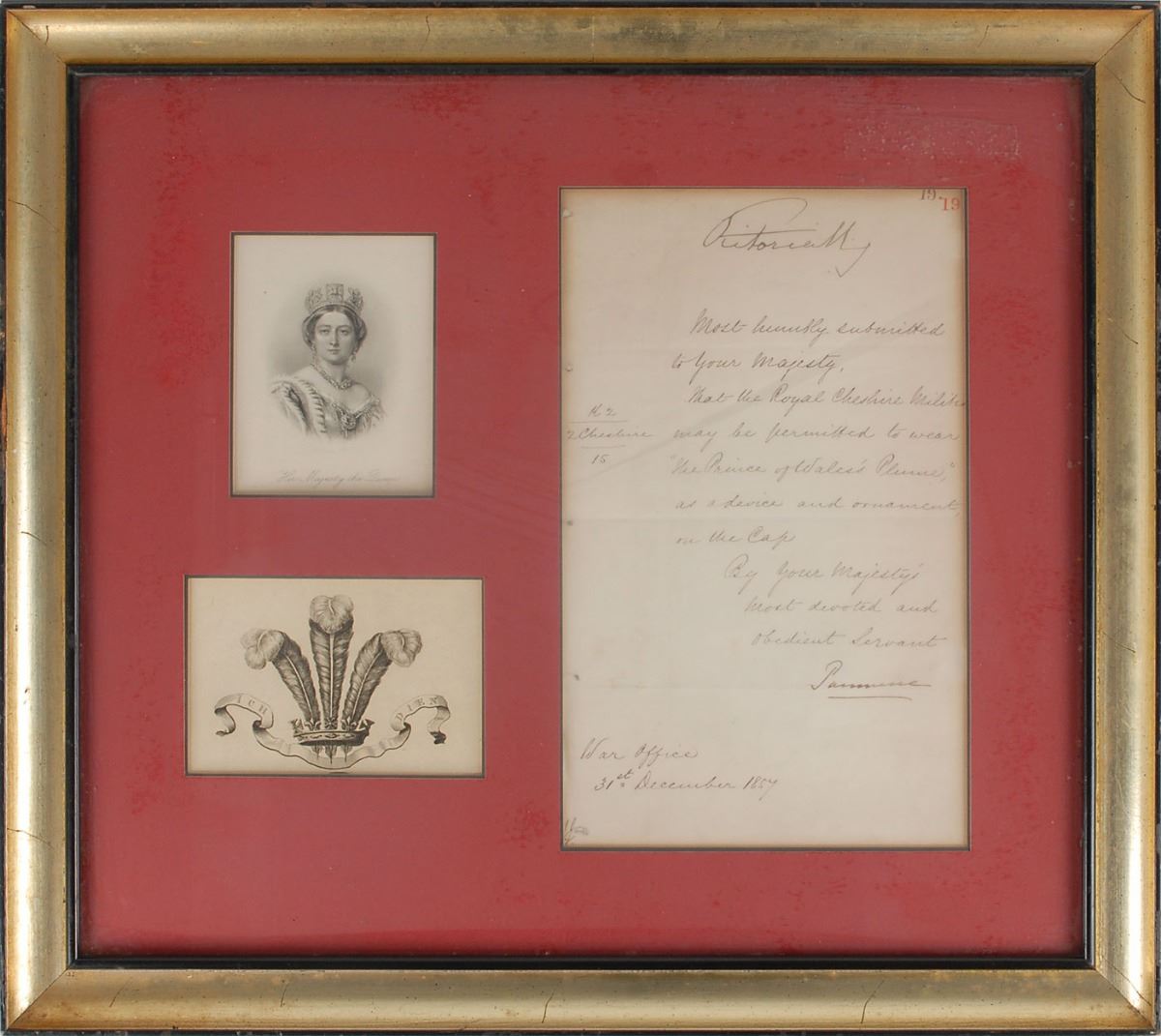 Manuscript DS, signed “Victoria R,” one page, 7.5 x 12.5, December 31, 1857. In part: “Most humbly submitted to your majesty, that the Royal Cheshire Militia may be permitted to wear ‘The Prince of Wales’s Plume,’ as advice and ornament on the Cap.” Signed at the top by Queen Victoria. Double-matted and framed with two engravings to an overall size of 21.5 x 19.5. In fine condition, with intersecting folds, and five binding holes along the left edge.