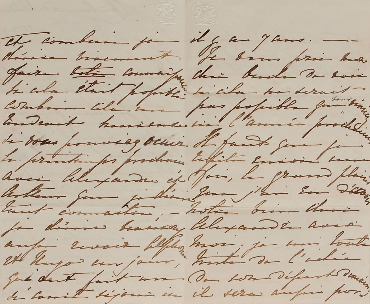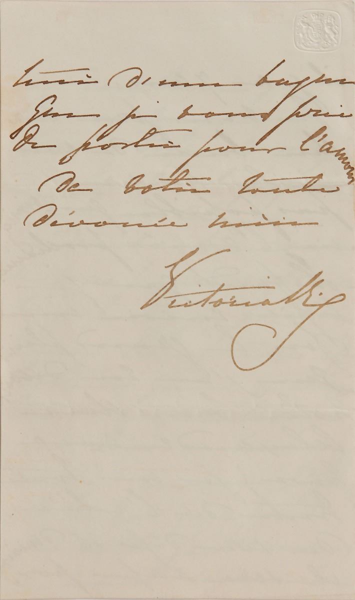 ALS in French, signed “Victoria R,” four pages on two adjoining sheets, 4.25 x 7.25, September 6, 1839. Letter to "My very dear Uncle," Emmanuel von Mensdorff-Pouilly. In part (translated): "I cannot leave out your excellent son, dear Alexander, whom I love like a brother, without sending some lines of good cheer and to say with what pleasure I made the acquaintance of dearest Alexander and how much I also wanted to meet you, if this were possible. How much I would love you to come next spring with Alexander and Arthur. I would enjoy it so much to see again one day Alphons and Hugo who was appointed Companion of Honor 7 years ago." In fine condition. Pre-certified PSA/DNA.