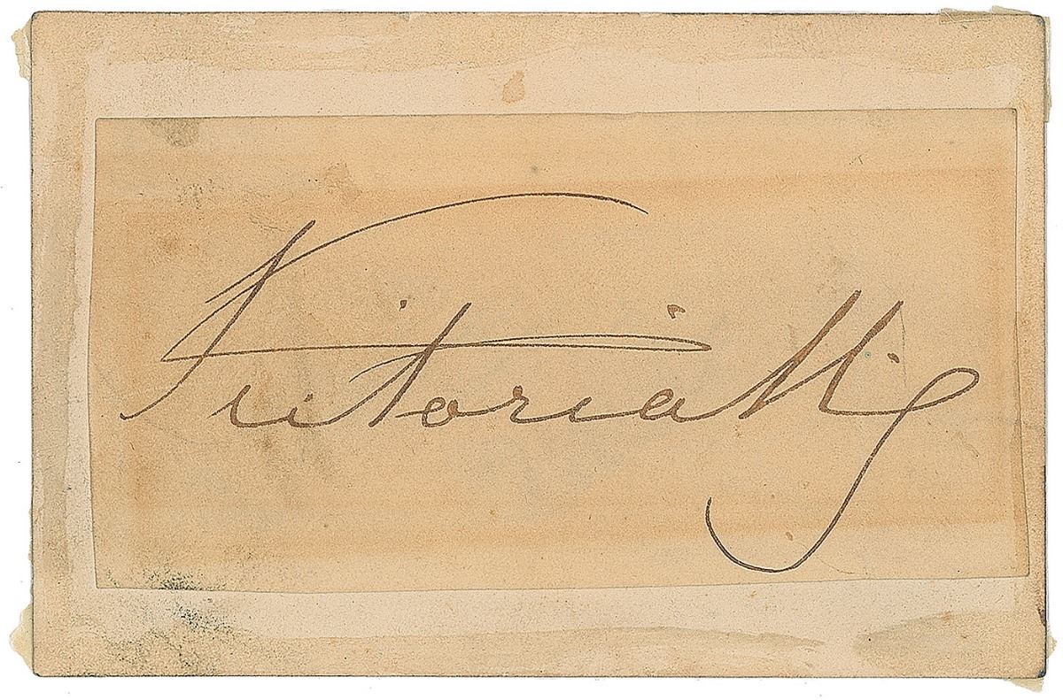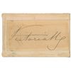Ink signature, "Victoria R,” on an off-white 1.75 x 3.25 slip affixed to a slightly larger card. In very good condition, with light soiling and a block of light toning. Pre-certified PSA/DNA.