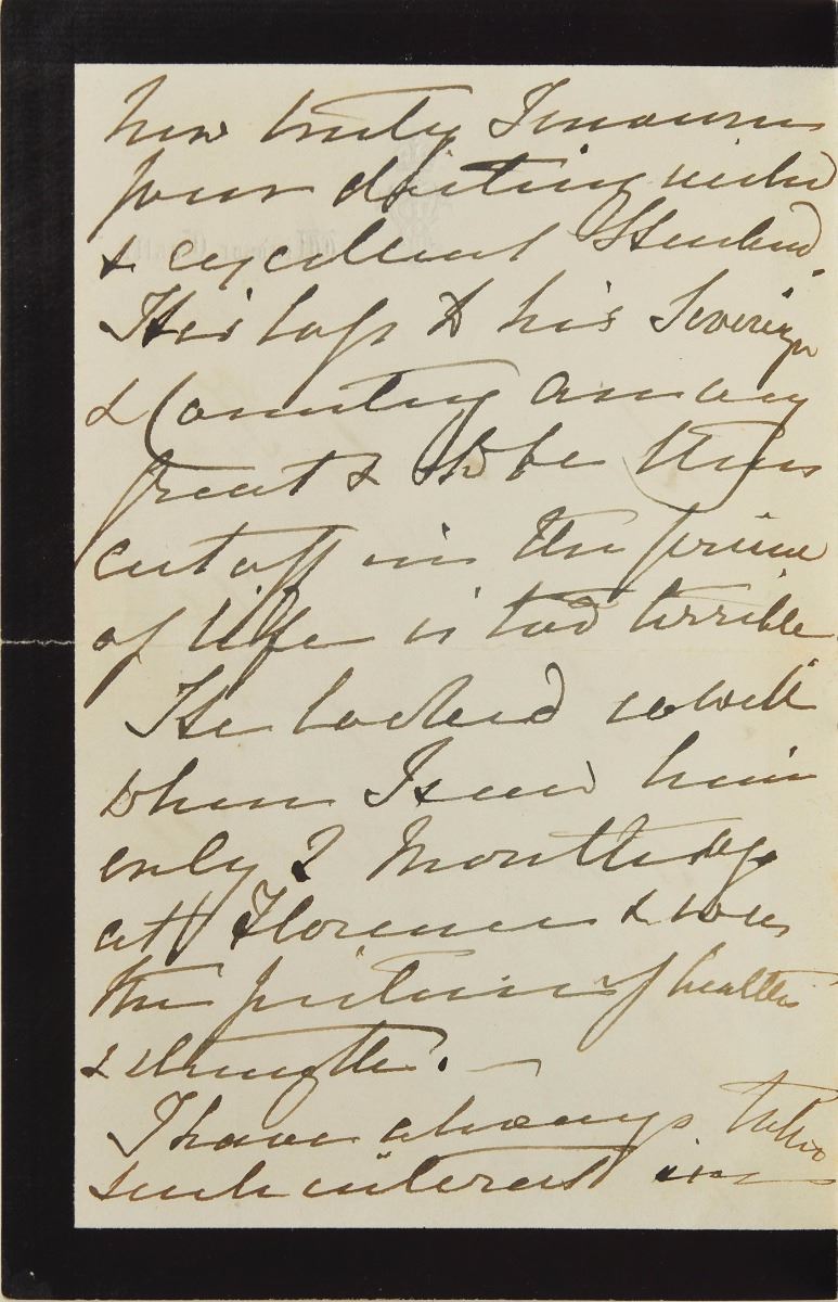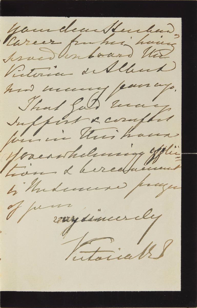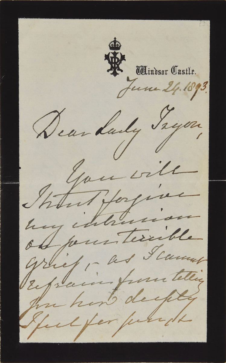 ALS signed “Victoria R. I.,” three pages on two adjoining sheets, 4.5 x 7, black-bordered Windsor Castle letterhead, June 24, 1893. Letter to Lady Tryon, in part: "You will I trust forgive my intrusion on your terrible grief, as I cannot refrain from telling you how deeply I feel for you, and how truly I mourn your distinguished & excellent Husband. His loss to his Sovereign & Country are very great & to be thus cut off in the prime of his life is too terrible." In fine condition, with some light creasing to the borders. Accompanied by the original mailing envelope with black wax seal.