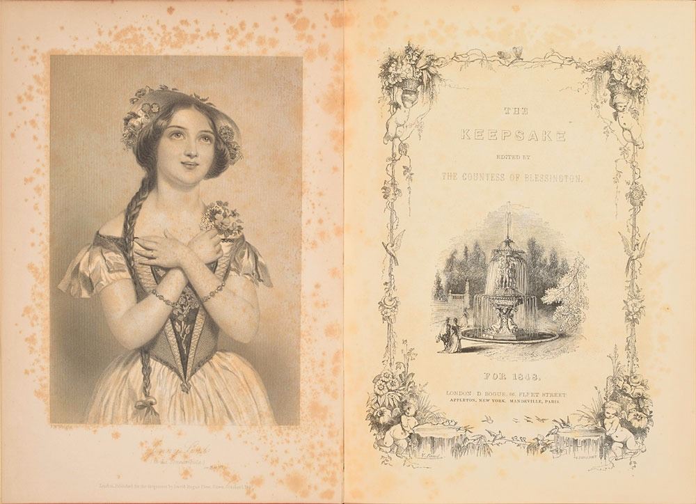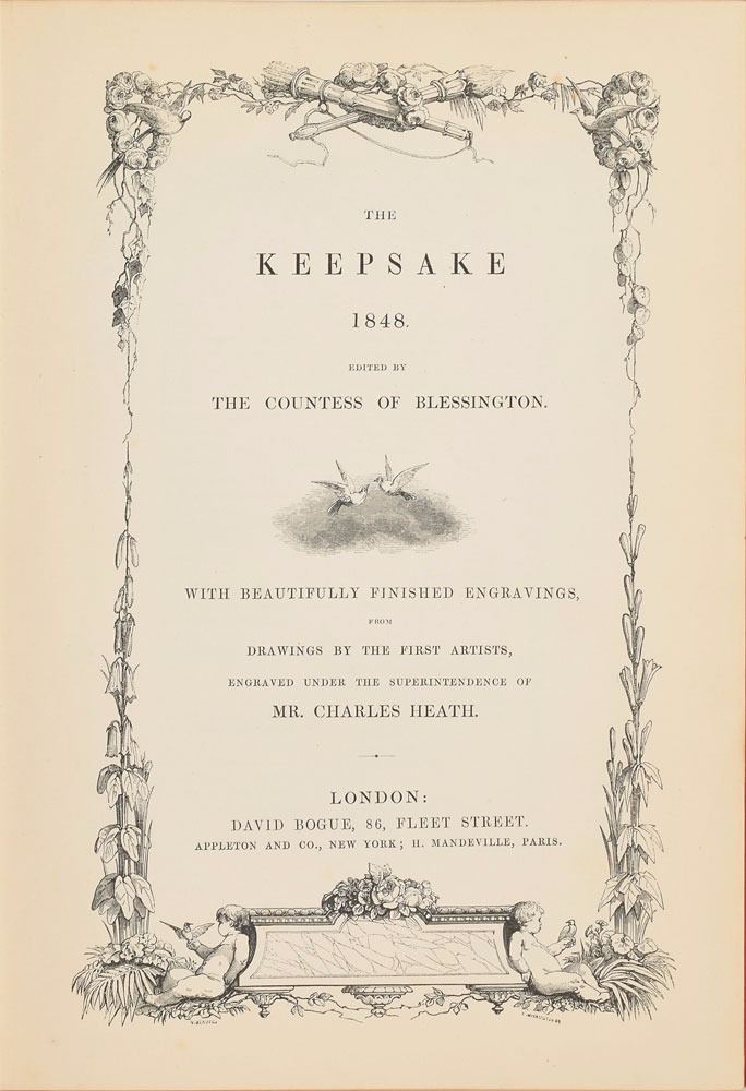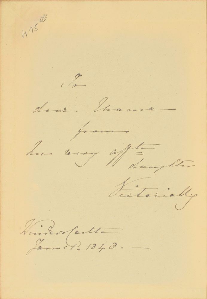 Signed book: The Keepsake for 1848. First edition. London: D. Bogue, 1848. Hardcover, 7 x 9.75, 280 pages. Signed and inscribed on the front pastedown to her mother, Princess Victoria of Saxe-Coburg-Saalfeld, in black ink, "To dear Mama, from her very affect. daughter, Victoria R., Windsor Castle, Jan: 1, 1848." Autographic condition: fine. Book condition: VG/None, with wear at spine ends, bumped corners, and front board slightly loose. The Keepsake was an English literary annual published at Christmas, edited by Marguerite Gardiner, Countess of Blessington. A remarkable gift between major members of the royal family.