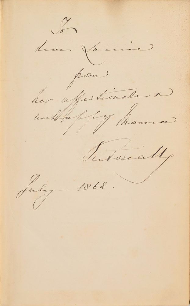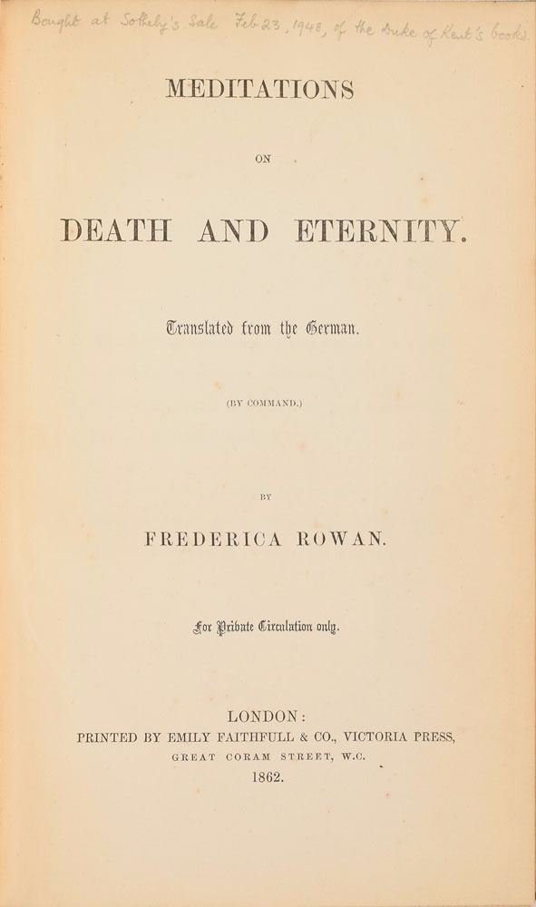 Signed book: Meditations on Death and Eternity. London: Emily Faithfull & Co., 1862. Hardcover, 5.75 x 8.75, 385 pages. Signed and inscribed on the first free end page in black ink to her daughter Princess Louise, "To dear Louise, from her affectionate & unhappy Mama, Victoria R, July 1862." A royal crest bookplate is affixed to the front pastedown, and the title page bears a pencil notation: "Bought at Sotheby's sale Feb 23, 1948, of the Duke of Kent's books." Autographic condition: fine, with some toning to the edges of the signed page. Book condition: VG/None, with minor soiling and edgewear. Victoria's husband and Louise's father, Prince Albert, had passed away on December 14, 1861, perhaps prompting the thoughtful gift of this volume several months later.