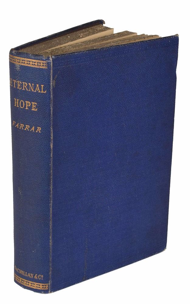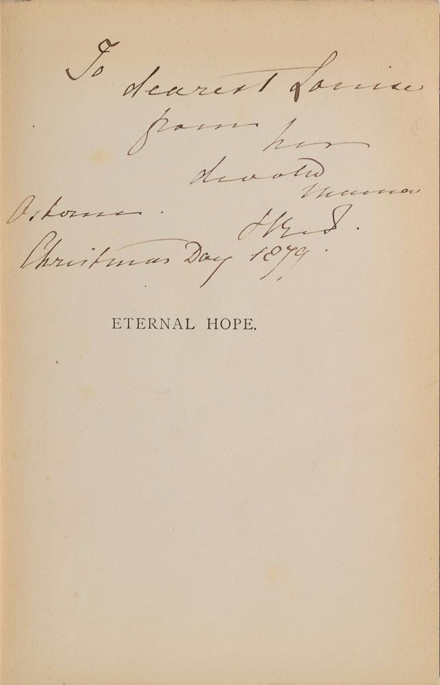 Signed book: Eternal Hope. London: Macmillan, 1878. Hardcover, 5.25 x 7.5, 227 pages. Signed and inscribed on the half-title page in black ink to Princess Louise, "To dearest Louise, from her devoted Mama, V. R. I., Osborne, Christmas Day 1879." An ownership inscription in pencil opposite the half-title page notes, "Bought at Sotheby's sale Feb 23, 1948 of the Duke of Kent's books." Autographic condition: fine, with mild toning to perimeter of signed page. Book condition: VG/None, with a cracked front hinge and minor edgewear.