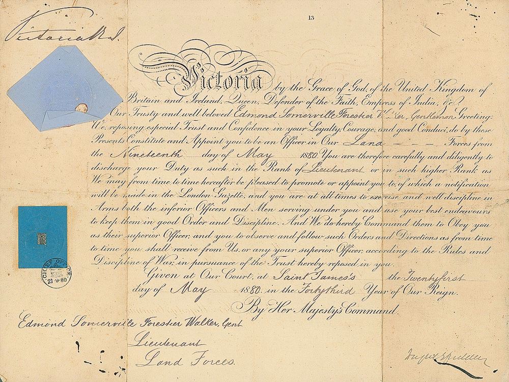 Partly-printed DS, signed “Victoria R. I.,” one page, 15.75 x 12, May 21, 1880. The queen appoints Edmond Somerville Forestier Walker as "Officer in Our Land Forces…in the Rank of Lieutenant." Signed in the upper left corner by Victoria. The document retains its original blue paper seal and treasury stamp. In very good condition, with document having been professionally silked on the reverse to repair intersecting fold separations, and scattered light toning and foxing.