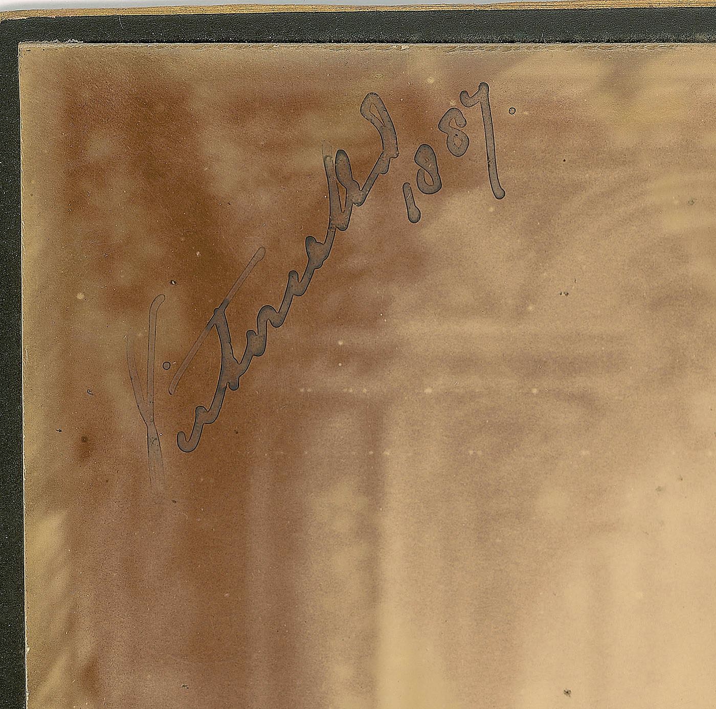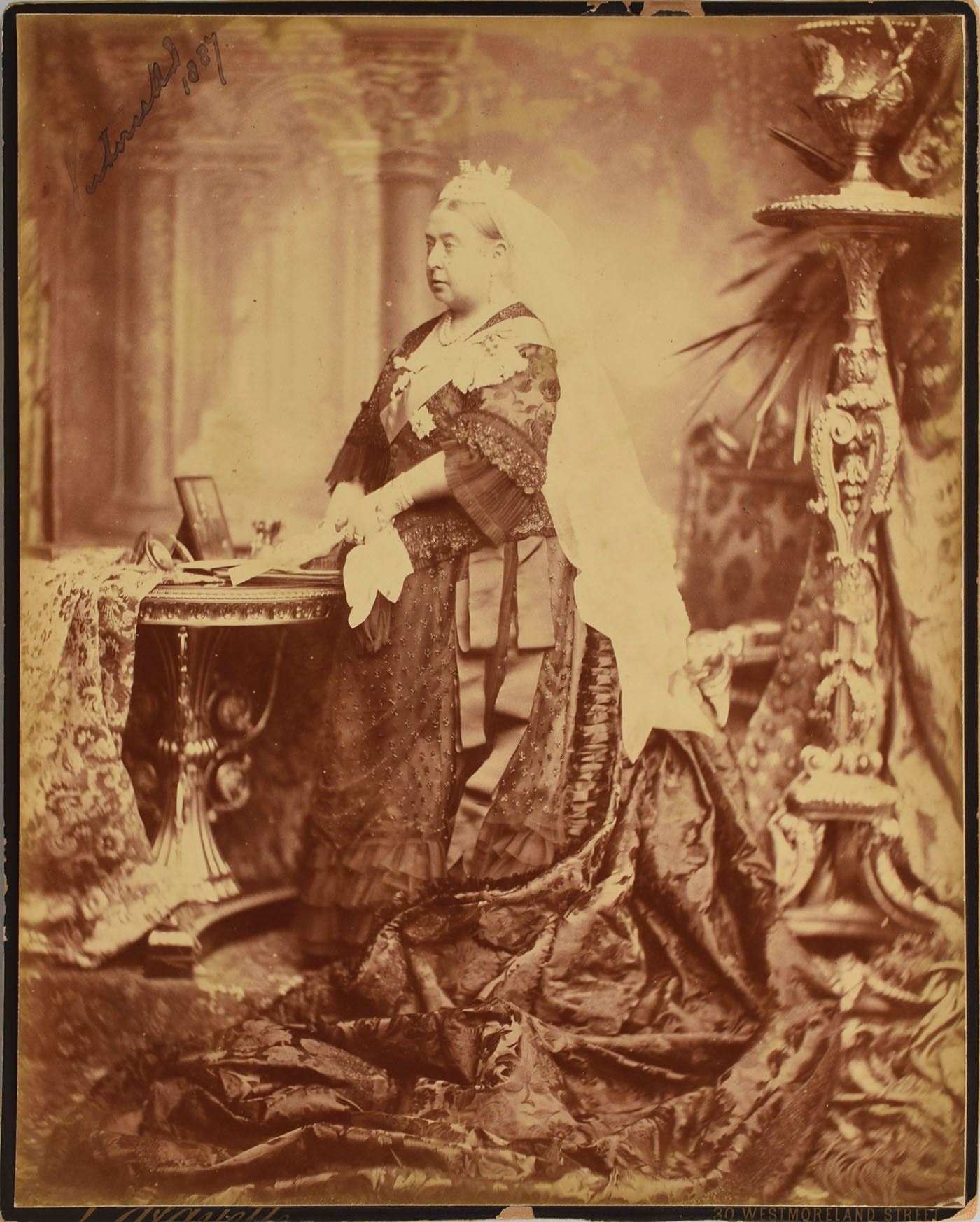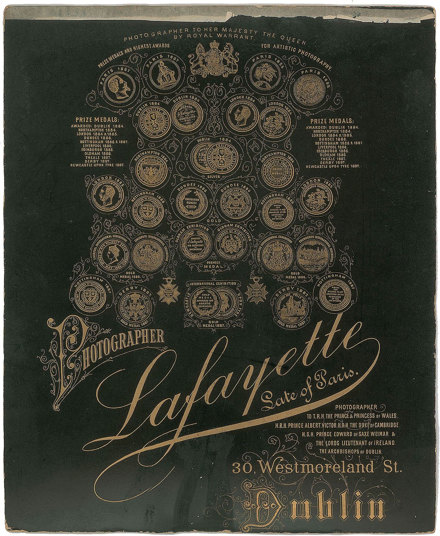 Scarce oversized 9.25 x 11.5 imperial cabinet portrait of Queen Victoria in a splendid full-length pose, signed in the upper left in black ink, "Victoria R. I., 1887." Photographed by Lafayette of Dublin, the official photographer to Her Majesty the Queen by Royal Warrant, the photo is affixed to the original studio mount. In fine condition, with the signature a couple shades light, some chipping and trimmed edges to the mount, and edges of the photo slightly peeling. Victoria remains scarce in signed photos of such large size.