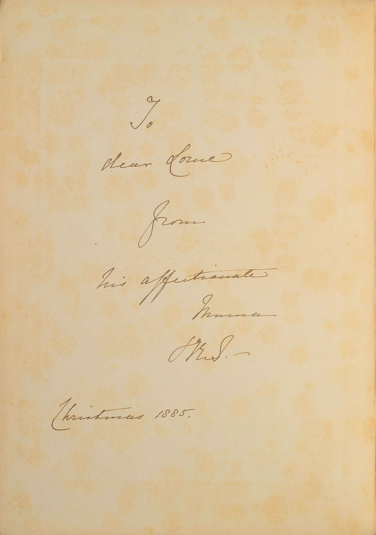 Signed book: Windsor: A Description of the Castle, Park, Town and Neighbourhood. London: Seeley & Co., 1886. Hardcover, 10.5 x 14, 91 pages. Signed and inscribed on a free end page in ink to her son-in-law, "To dear Lorne, from his affectionate Mama, V. R. I., Christmas 1885." An ownership inscription in pencil on the first free end page notes, "Bought at Sotheby's sale Feb 23, 1948 of the Duke of Kent's books. Lot 172." Autographic condition: fine, with light foxing and staining to the beginning pages, including the signed page; interior pages are generally clean. Book condition: VG/None, with edgewear to boards and corners. The recipient, John Campbell, 9th Duke of Argyll, Marquess of Lorne, was the husband of Victoria's daughter Princess Louise; he served as the governor general of Canada from 1878 to 1883. A significant association copy.