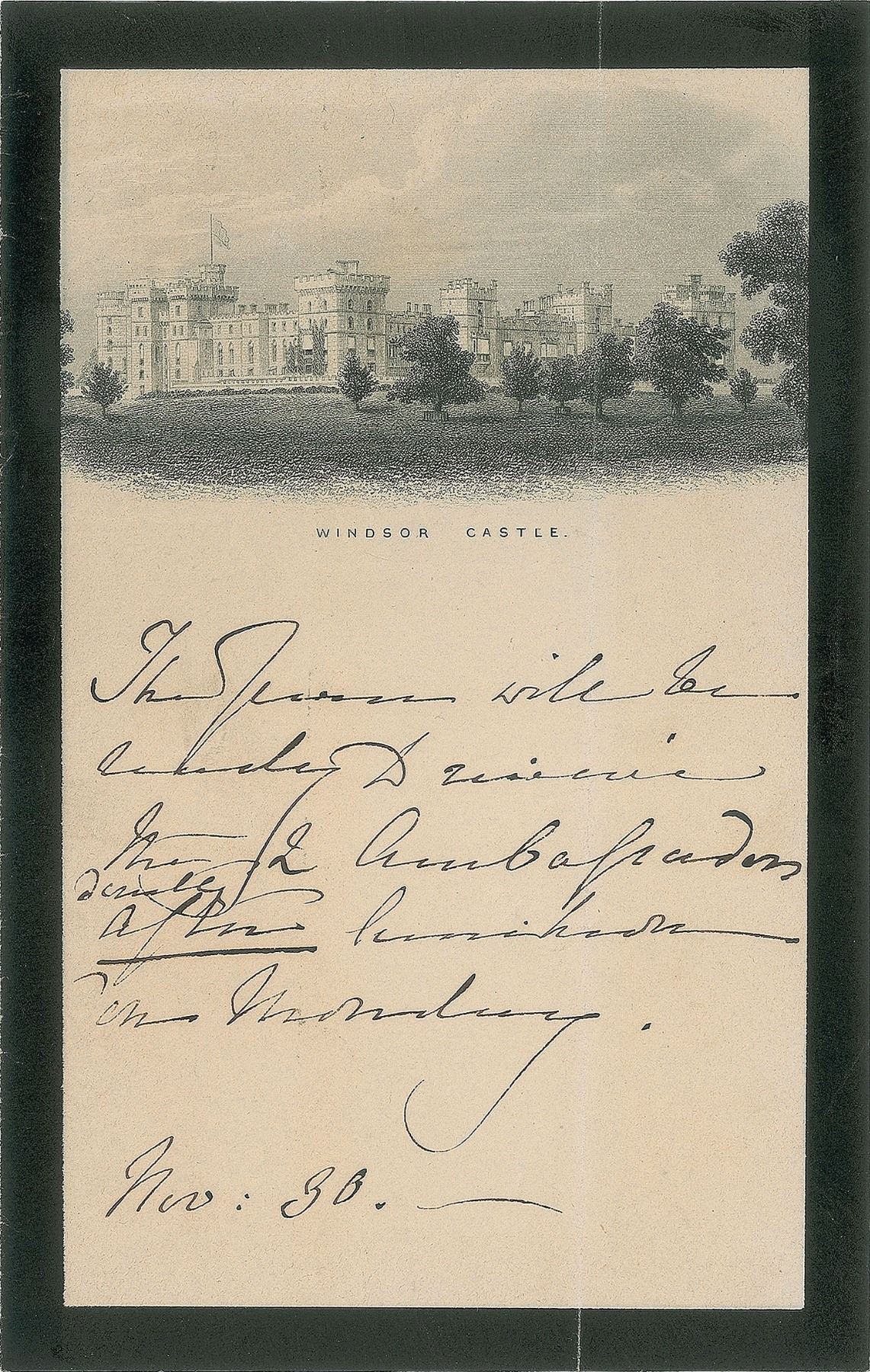 Third-person ALS, signed within the text, “The Queen,” one page, 4.5 x 7, black-bordered Windsor Castle stationery, November 30, no year. In full: "The Queen will be ready to receive the 2 Ambassadors directly after luncheon on Monday." In fine condition.