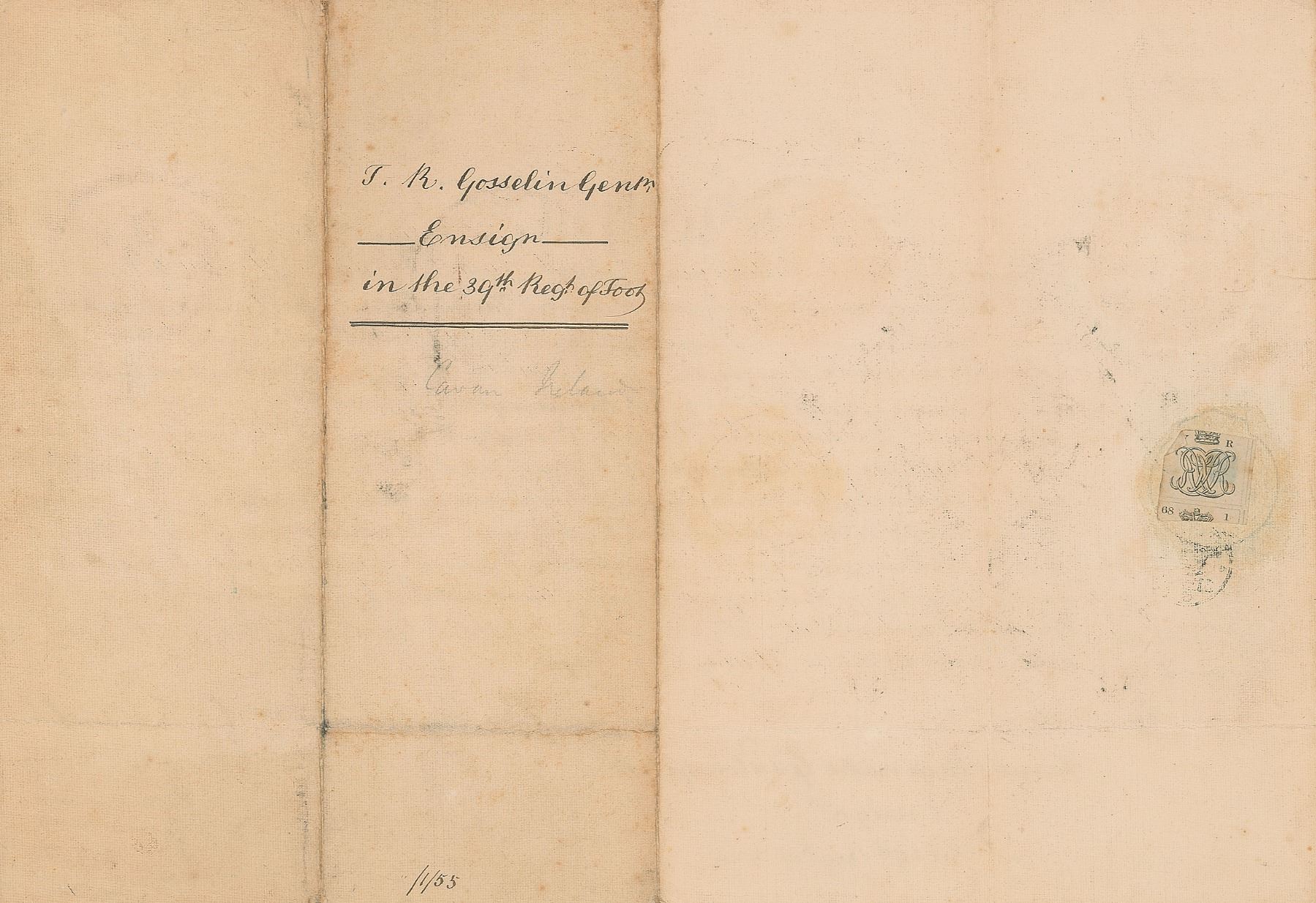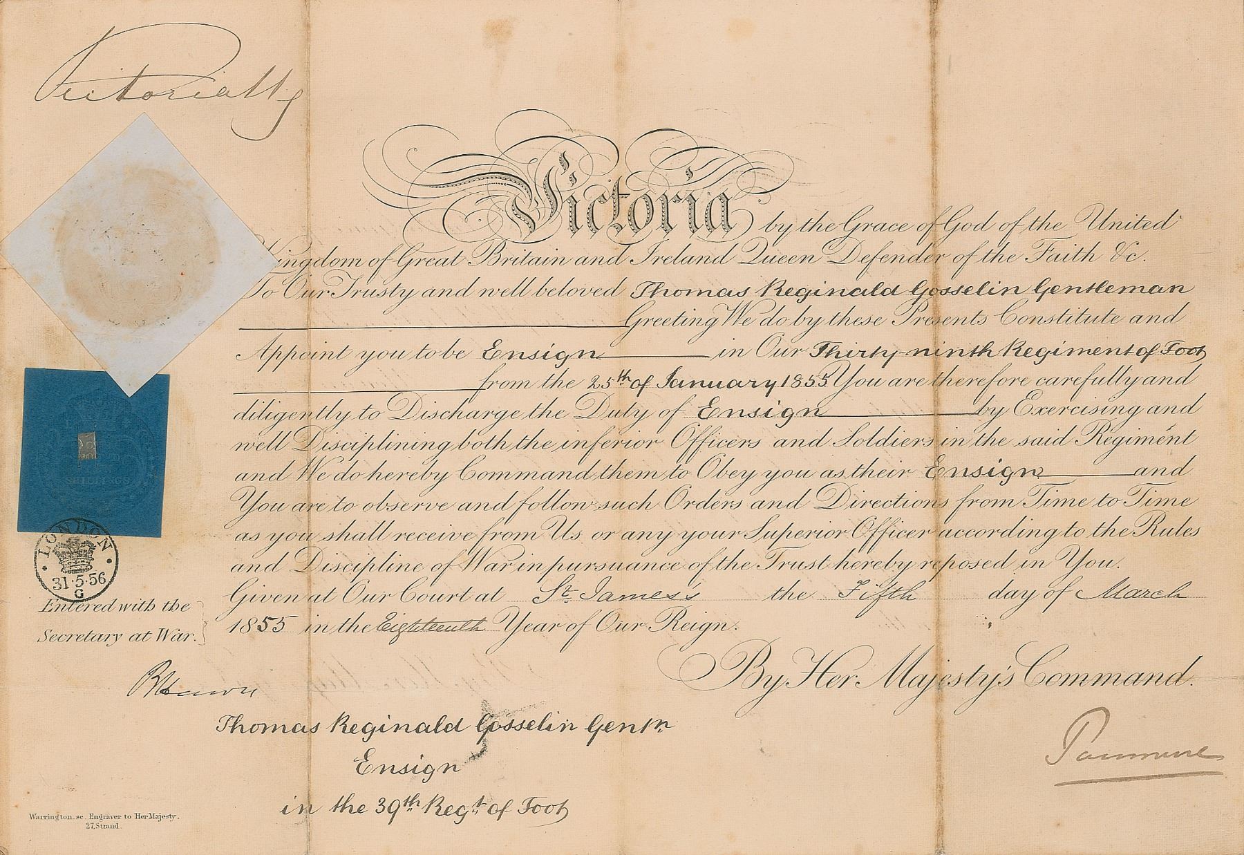 Partly-printed DS, signed “Victoria R.,” one page, 13.75 x 9.5, March 5, 1855. Queen Victoria appoints Thomas Reginald Gosselin as an "Ensign in Our Thirty-ninth Regiment of Foot." Prominently signed in the upper left by the queen. The white and blue paper seals remain affixed to left side. In very good to fine condition, with a few light stains, and light toning along the vertical folds.