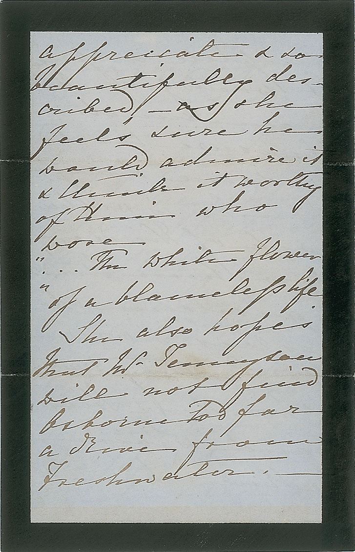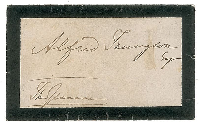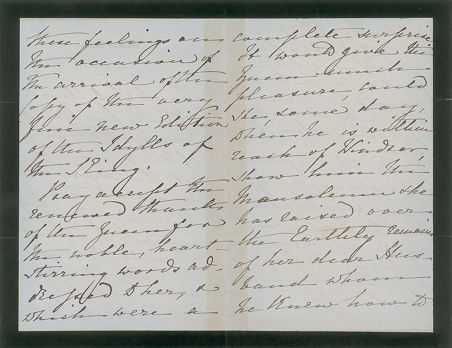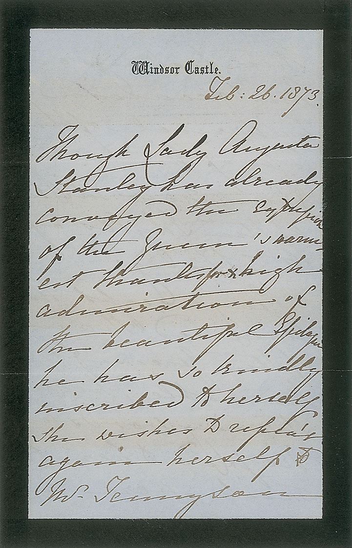 Important third-person autograph letter, signed "the Queen" within the text, four pages on two adjoining sheets, 4.5 x 7, black-bordered Windsor Castle letterhead, February 26, 1873. Letter to the Poet Laureate of the United Kingdom, Alfred Tennyson, thanking him for the dedicatory epilogue to 'Idylls of the King.' This is the first known letter from Victoria to Tennyson. In part: "Through Lady Augusta Stanley has already conveyed…the Queen's warmest thanks for & high admiration of the beautiful Epilogue he has so kindly inscribed to herself, she wishes to repeat again herself to Mr. Tennyson these feelings on the occasion of the arrival of the Copy of the very fine new edition of the Idylls of the King. Pray accept the renewed thanks of the Queen for the noble, heart-stirring words addressed to her, & which were a complete surprise. It would give the queen much pleasure could she, some day, when he is within reach of Windsor, show him the Mausoleum she has raised over the Earthly remains of her dear Husband whom he knew how to appreciate & so beautifully described." Includes the original transmittal envelope addressed in Queen Victoria's hand, "Alfred Tennyson, Esq., The Queen." In fine condition.