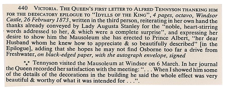 Tennyson visited the Mausoleum at Windsor on March 6th. In her journal, the queen recorded her satisfaction with the meeting: 'When I showed him some of the details of the decorations in the building he said the whole effect was very beautiful & worthy of what it was intended for.' A spectacular piece of significant correspondence.