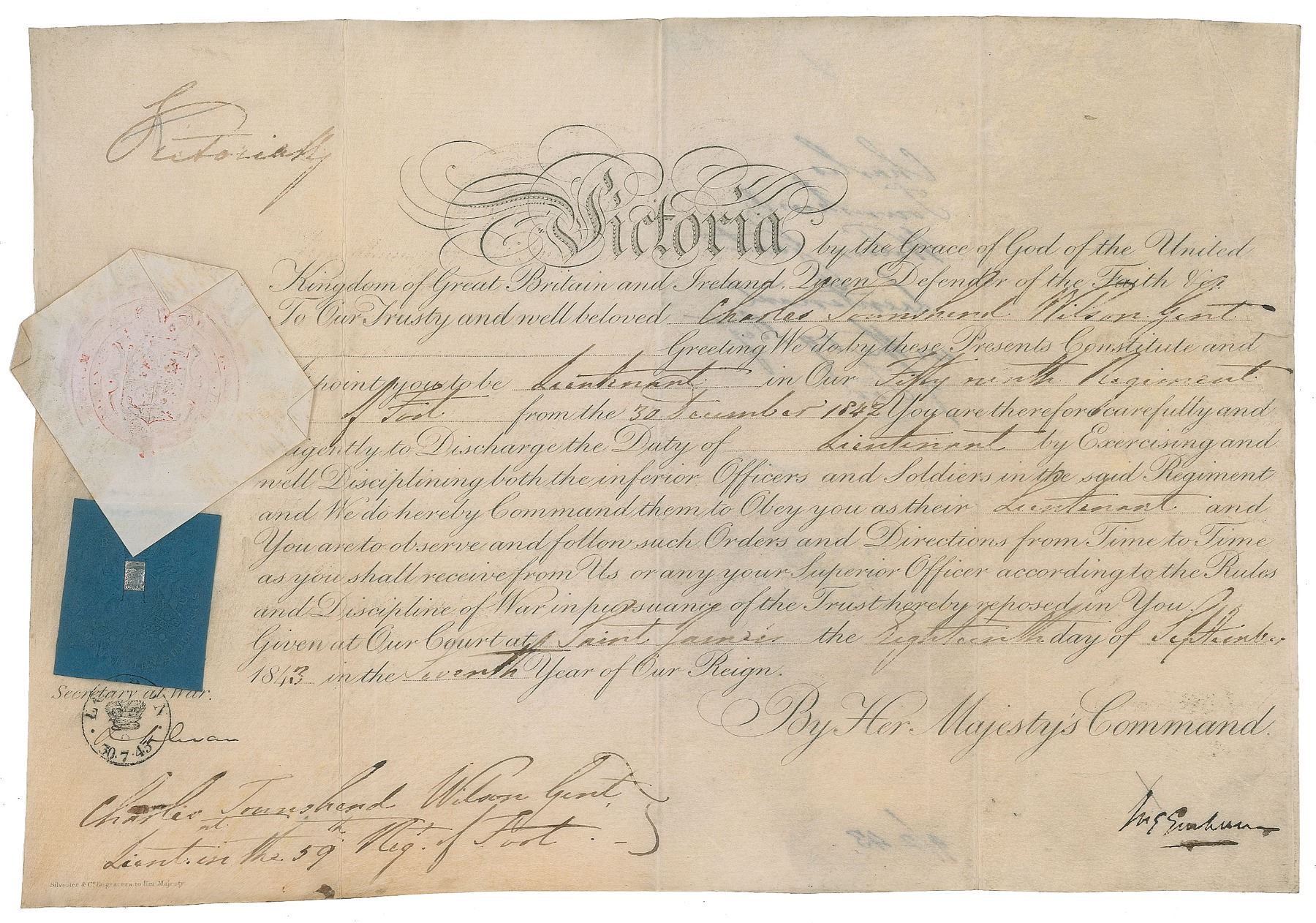 Partly-printed vellum DS as queen, signed “Victoria R.,” one page, 13.25 x 9, September 18, 1843. Queen Victoria appoints Charles Townshend Wilson "to be Lieutenant in Our Fifty ninth Regiment of Foot." Signed in the upper left by the queen, with the original white and blue paper seals affixed below. In very good to fine condition.