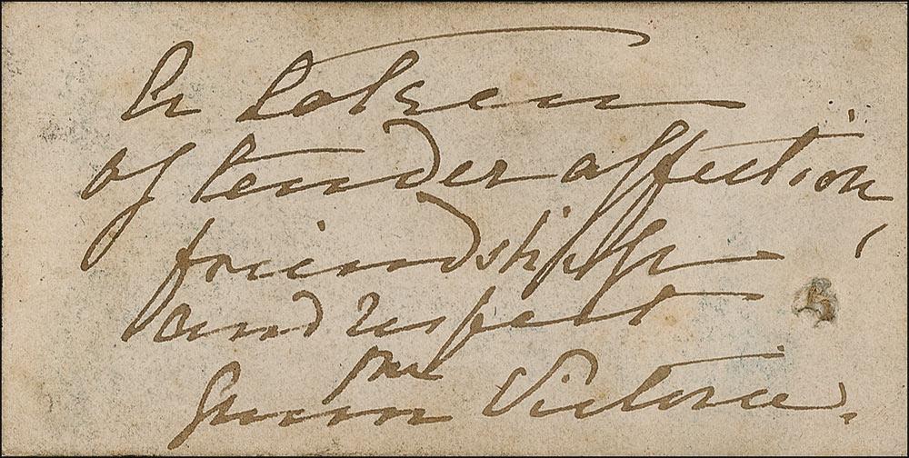 Fountain pen signature, “A token of tender affection, friendship and respect from Queen Victoria,” on an off-white 3.25 x 1.75 card. Affixed to an 8 x 10.25 mat and displayed with a portrait of the queen. In very good condition, with scattered toning and soiling, and a small hole to right blank area.