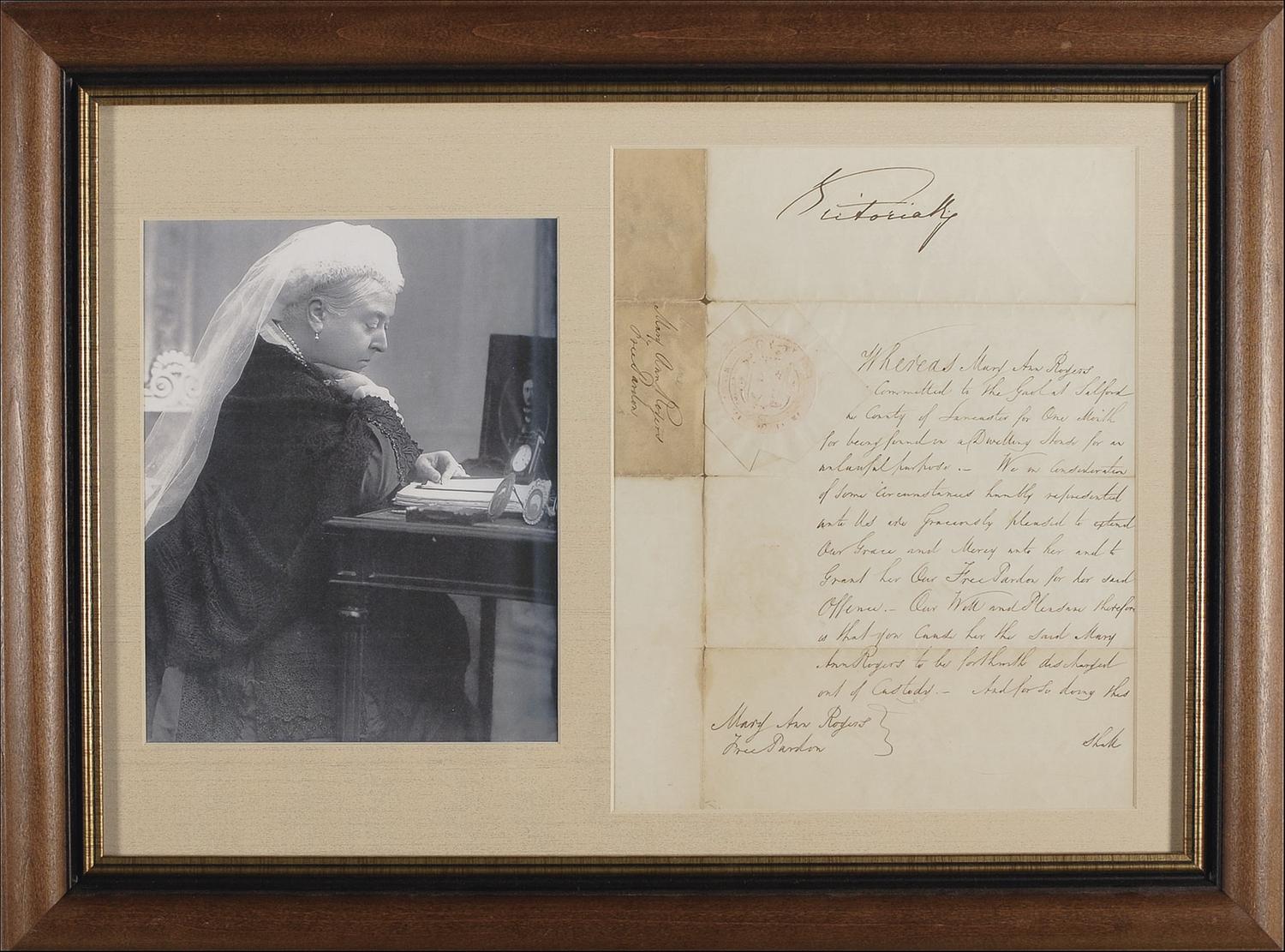Manuscript DS, signed “Victoria R,” one page both sides, 9.5 x 12, March 4, 1844. A pardon issued to Mary Ann Rogers, currently confined to the Jail at Salford, “for being found in a Dwelling House for an unlawful purpose. We in consideration of some circumstances humbly represented to us are graciously pleased to extend our Grace and Mercy unto her and to Grant her Our Free Pardon for her said offense.” Boldly signed across the top of the front by Victoria. Matted and framed, so both sides may be read, with a portrait of Victoria, to an overall size of 23.5 x 18. In very good condition, with intersecting folds, one directly under Victoria’s signature, a few small repairs to fold separations on reverse, scattered toning and soiling, and small areas of paper loss at junction of folds. The paper seal is worn, but intact. While documents signed by Victoria are available, pardons are far less common.