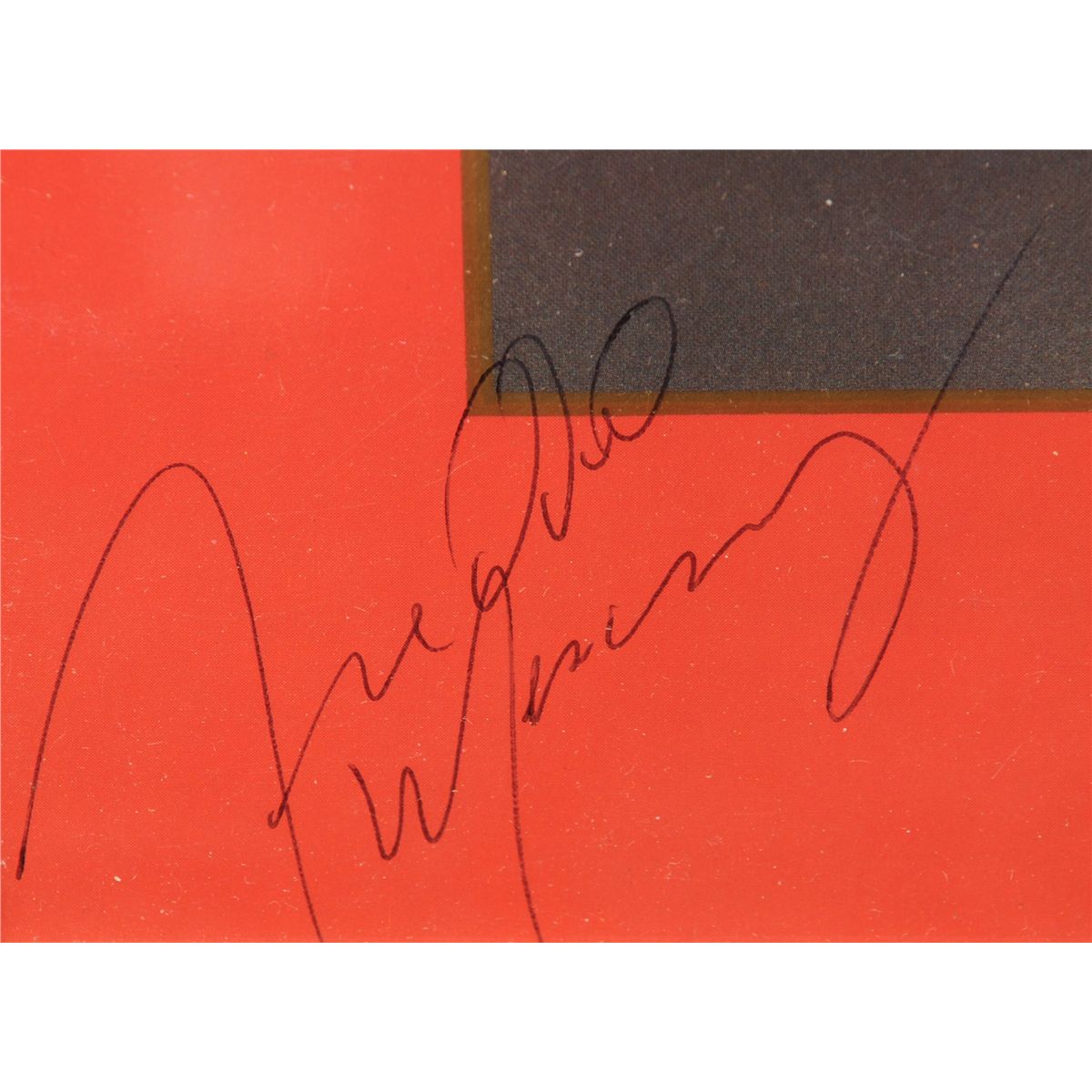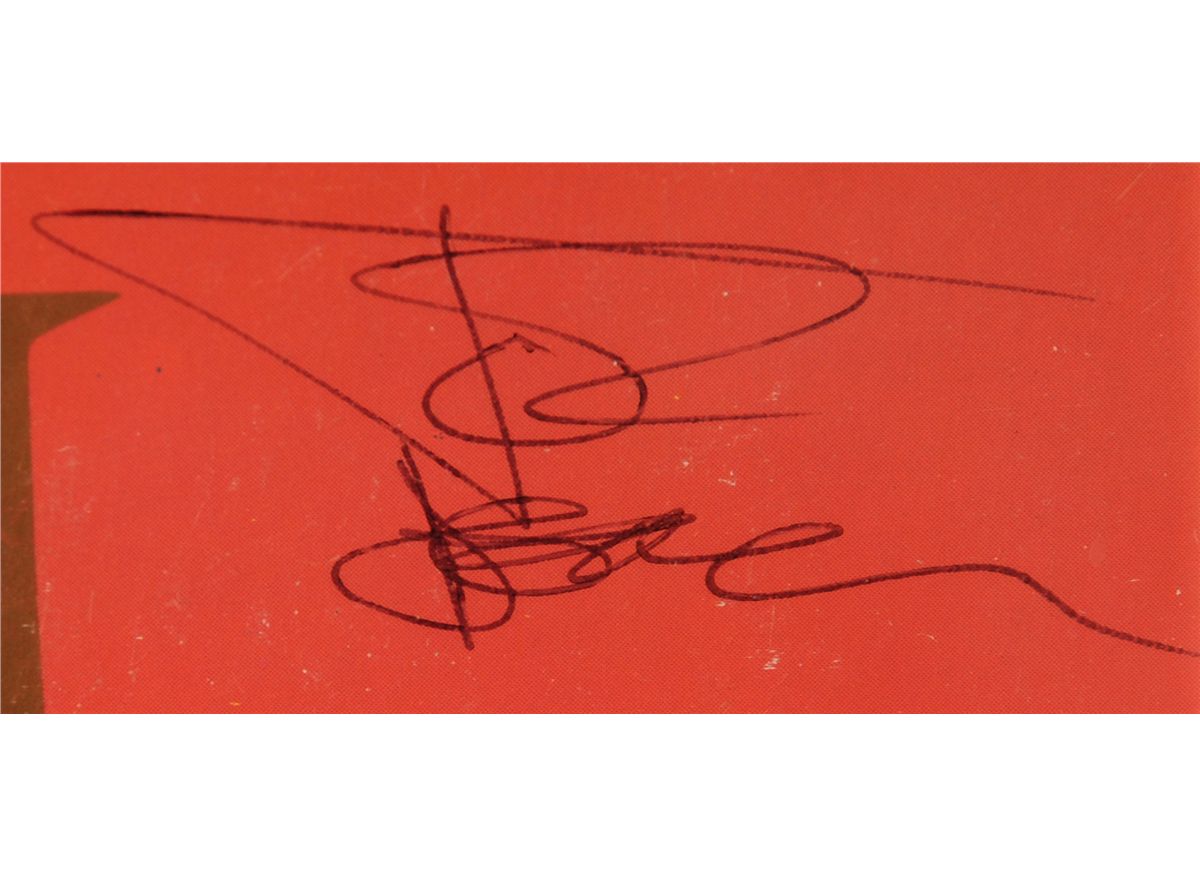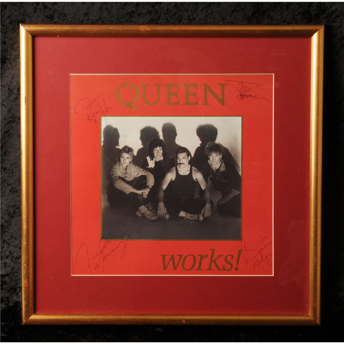 signed by all four band members Freddie Mercury, Roger Taylor, Brian May and John Deacon in black brio in each of the four corners, framed