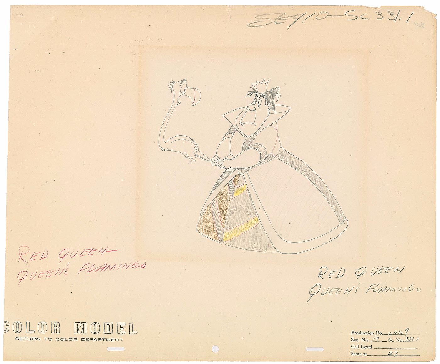 (Walt Disney Studios, 1951) Original color model production drawing featuring Queen of Hearts and a flamingo from Alice in Wonderland, stamped in the lower left, "Color Model, Return to Color Department." Accomplished in graphite and colored pencil on untrimmed 15 x 12.5 animation paper. Image measures 6.5 x 6.25. In fine condition, with a light block of toning around the character, a bit of paper loss to upper right, and some small edge tears and tack holes.