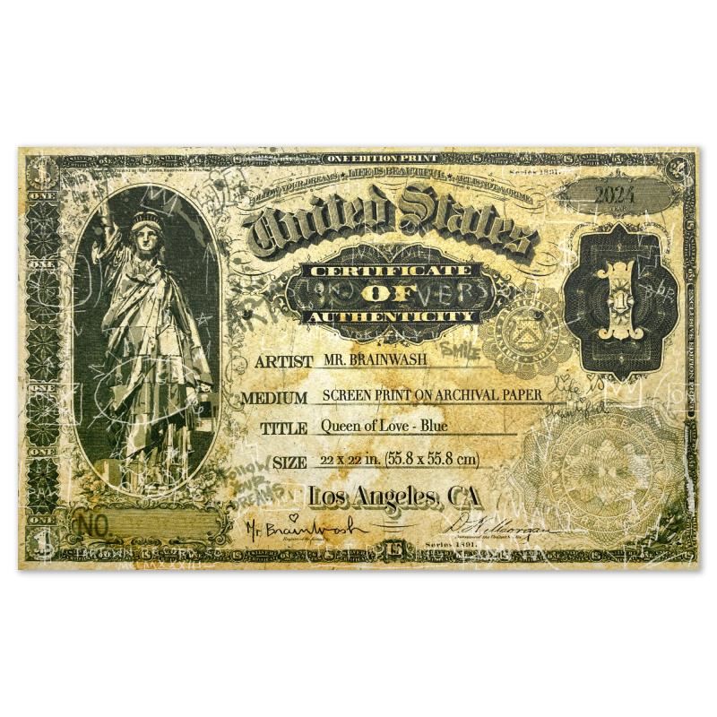 "Queen of Love (Blue)" is a limited edition silk screen print on paper by Mr Brainwash, hand signed and thumb-printed by the artist. The piece comes custom framed with a Certificate of Authenticity. Measures approx. 26" x 26" (framed), 22" x 22" (image).