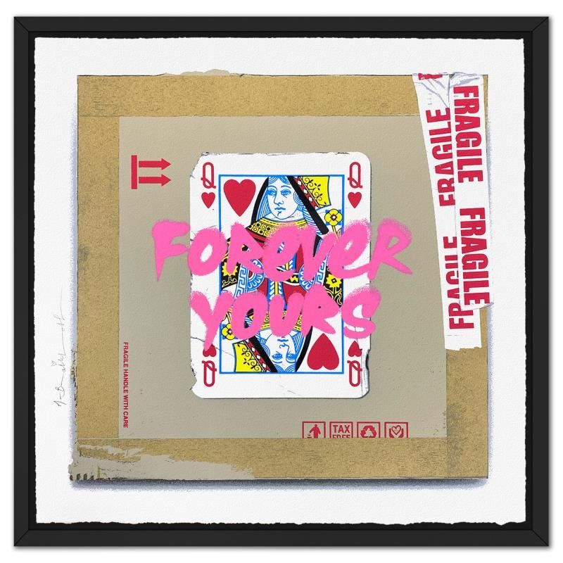 "Queen of Love (Pink)" is a limited edition silk screen print on paper by Mr Brainwash hand signed and thumb-printed by the artist. The piece comes custom framed with a Certificate of Authenticity. Measures approx. 26" x 26" (framed) 22" x 22" (image).