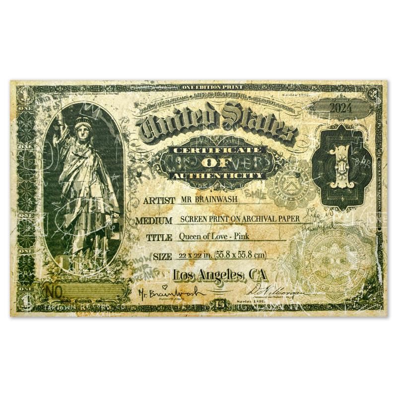 "Queen of Love (Pink)" is a limited edition silk screen print on paper by Mr Brainwash, hand signed and thumb-printed by the artist. The piece comes custom framed with a Certificate of Authenticity. Measures approx. 26" x 26" (framed), 22" x 22" (image). This item requires special handling and may have a longer than usual turnaround.