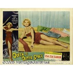 <B>Queen of Outer Space (Allied Artists, 1958).</B></I> Lobby Card (11" X 14"). Three male astronauts on the first mission to Venus arrive and find its population is entirely female! Go figure! This quirky little film, is a send-up of the sci-fi genre, and played very much for laughs. The attractive Zsa Zsa Gabor is one of the reasons material from this film is so popular. There are border pinholes, a few scattered pinholes in the background graphics, and one small smudge mark. This scene card features a stunning image of the glamorous Gabor. From the collection of Johnny Ramone. Fine+.