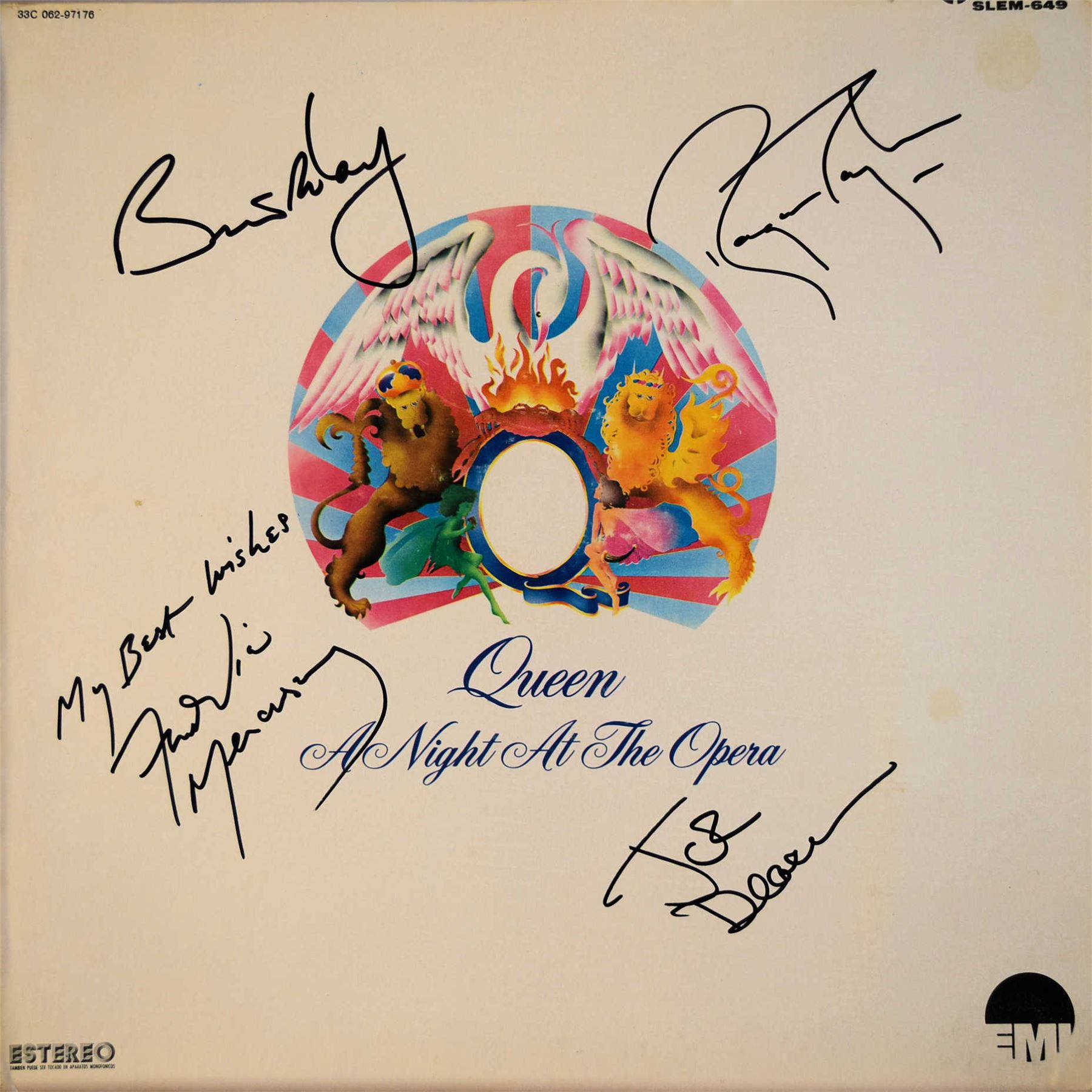 Queen 1975 A Night At The Opera album. Signed: My Best Wishes Freddie Mercury, Brian May, Roger Taylor, and John Deacon.