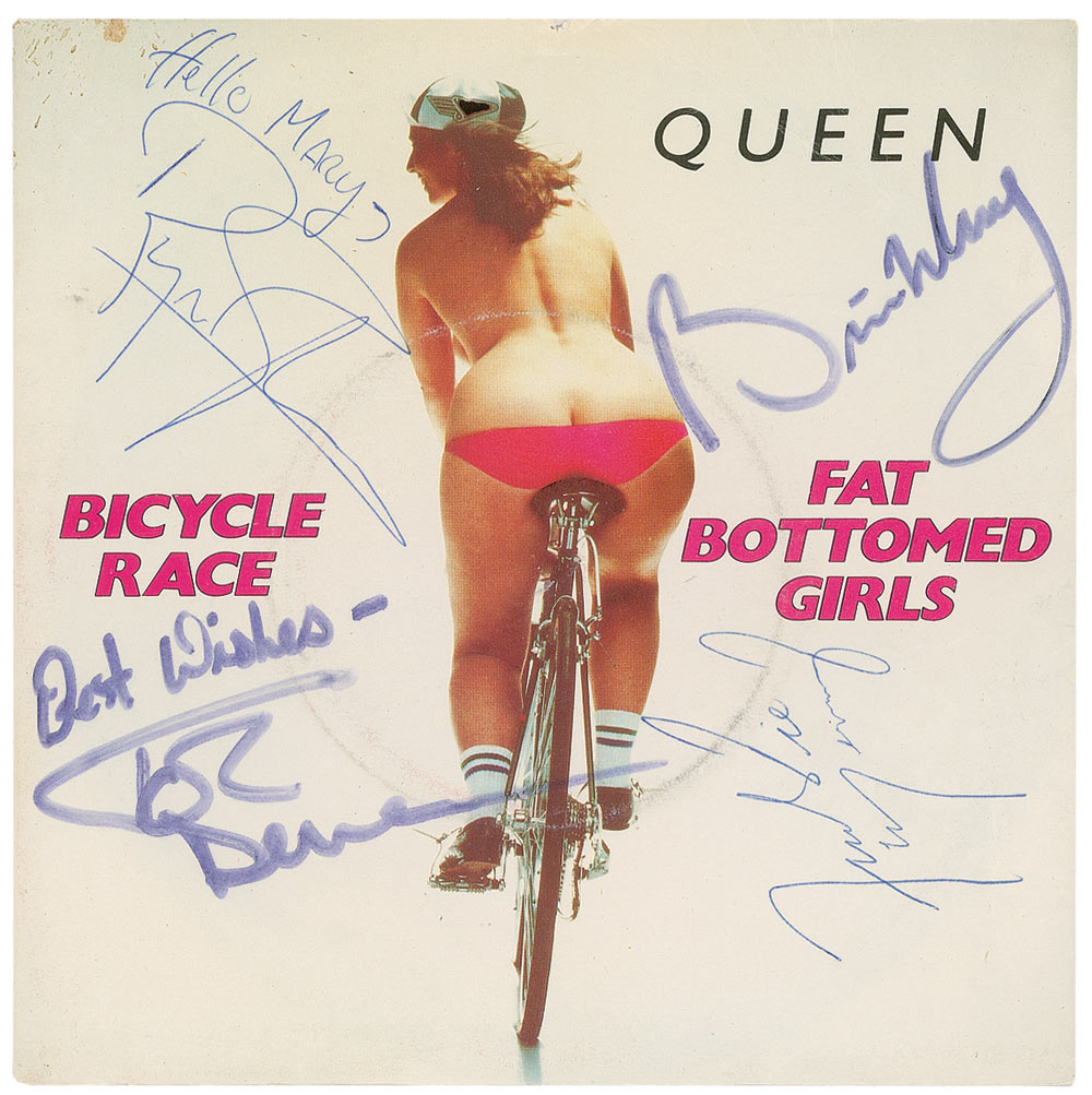 ‘Bicycle Race/Fat Bottomed Girls’ 45 rpm single, signed on the front in blue ballpoint and blue felt tip by Freddie Mercury, John Deacon, Brian May, and Roger Taylor, adding “Hello Mary.” Light, scattered creasing, a few small spots of soiling to top left corner, a small ding to the top edge, and ‘rings of wear’ to the front and back, otherwise fine condition. Record is included.