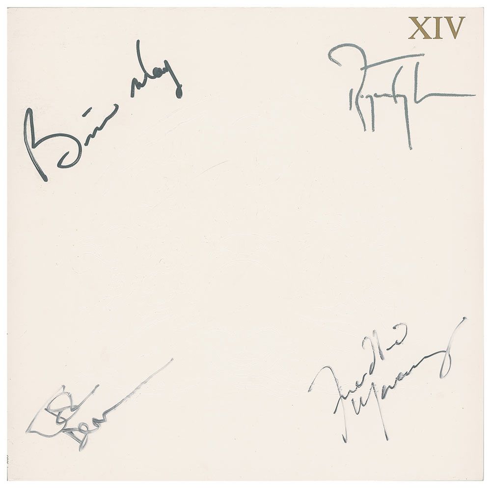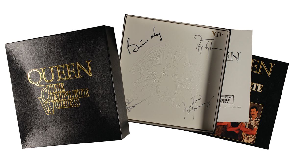 Box set entitled The Complete Works, 12.5 x 12.5, featuring all 11 of the band’s original studio albums, live album, and non-album tracks, each bearing different gold Roman numerals to the top right corner above the band’s embossed symbol from A Night at the Opera on each individual white album cover, signed on the album XIV in silver ink by Freddy Mercury, John Deacon, and Roger Taylor, and signed in black felt tip by Brian May. Set, encased in a black box with gold lettering, also includes a color accompanying booklet, featuring full color images of the members and each album; an itinerary program for their 1971–1985 World Tour; and a fold-out map of the world, with the locations Queen had toured colored in red. In fine condition. Issued in 1985, after Queen’s astronomically successful performance at Live Aid, Parlophone Records compiled the bands studio albums, their Live Killers album, and a disc containing all the A-sides and B-sides that never made it onto the albums, aptly entitled Complete Vision. The complete set represents the utmost definitive Queen collection.