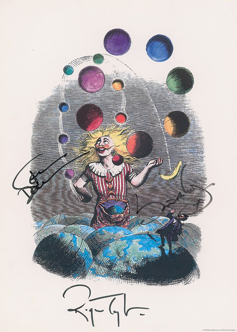 Color limited edition 10 x 14 Queen fan club promotional lithograph for Innuendo, signed in black felt tip by Brian May, Roger Taylor, and John Deacon. In fine condition, with an embossed stamp to lower left corner. Litho was a prize given out by the band’s fan club to promote their new album Innuendo. Signed items relating to the Innuendo album are quite scarce and highly prized by collectors.