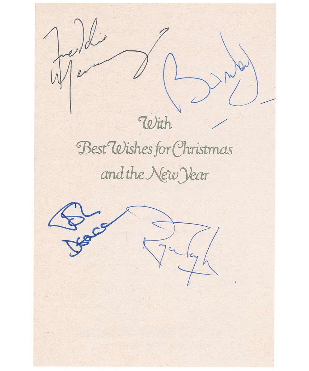 Christmas card, 4.25 x 6.5, featuring Santa sitting on an ornament on the front, signed inside in ballpoint and felt tip by Freddie Mercury, Brian May, Roger Taylor, and John Deacon. In fine condition, with a light crease to the upper left.