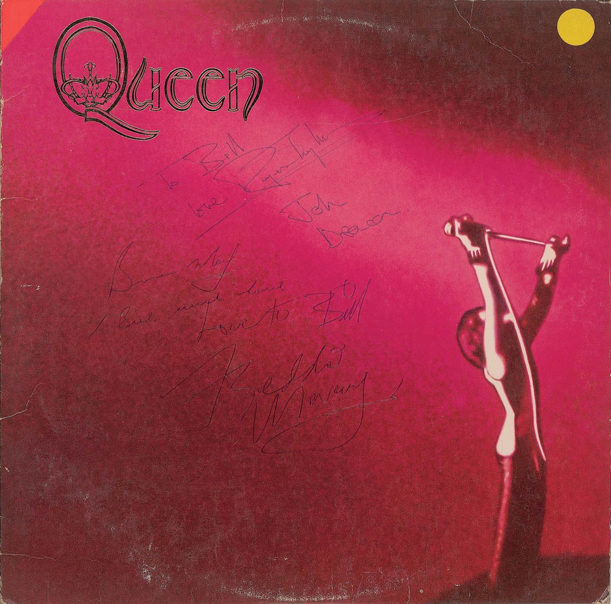 Queen debut album with gold embossed sleeve signed and inscribed on the front in ballpoint, “Love to Bill, Freddie Mercury,” “Brian May, to Bill with love,” “To Bill, love Roger Taylor,” and “John Deacon.” A few scattered creases, typical ‘ring of wear’ to front cover, and two stickers to the upper corners, otherwise fine condition. The record is included. The album was signed on May 2, 1974, following Queen's performance at Agricultural Hall in Allentown, Pennsylvania, during Queen's first US tour as support for Mott the Hoople. Fully signed albums from this era are virtually nonexistent, and there are few, if any, extant examples of the gold-embossed Queen I album signed by the band. Accompanied by an original 1973 ‘Queen Has Arrived’ promo banner and a letter of provenance from the musician who originally met the band and acquired the autographs. Accompanied by a full letter of authenticity from PSA/DNA.