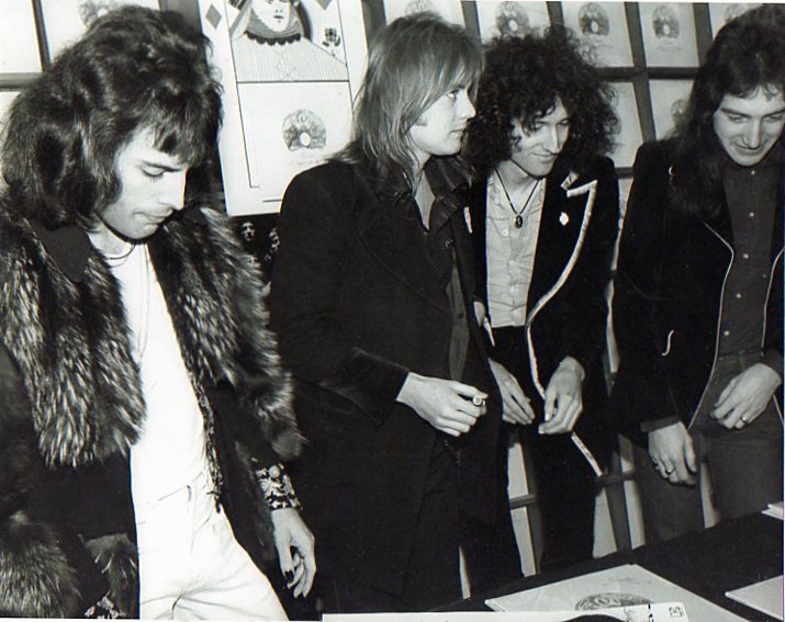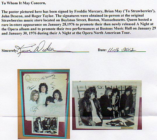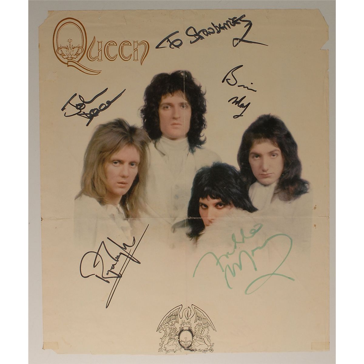 Scarce original first printing 1974 Queen II promo poster, 20 x 24, signed in green felt tip by Freddie Mercury and black felt tip by Brian May (who inscribes “To Strawberries”), John Deacon, and Roger Taylor. Central horizontal and vertical fold, tape re