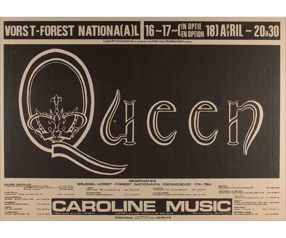 Original 33.75 x 24 concert poster for Queen’s concerts at the Forest National Stadium, in Brussels, Belgium, on April 16-18, 1978. In fine condition. Rolled. Accompanied by a certificate of authenticity from Tracks.