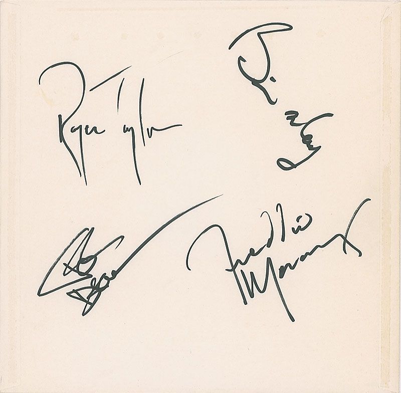 Off-white album sleeve, 12 x 12, boldly signed in black felt tip by Freddie Mercury, Brian May, Roger Taylor, and John Deacon. In fine condition. Accompanied by a full letter of authenticity from JSA.