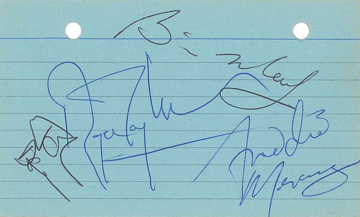 Excellent ballpoint signatures, “Freddie Mercury,” “Brian May,” “Roger Taylor,” and “John Deacon,” on a light blue 5 x 3 lightly-lined card. Collector’s notation on reverse indicates signatures were acquired in July of 1977. In very fine condition.