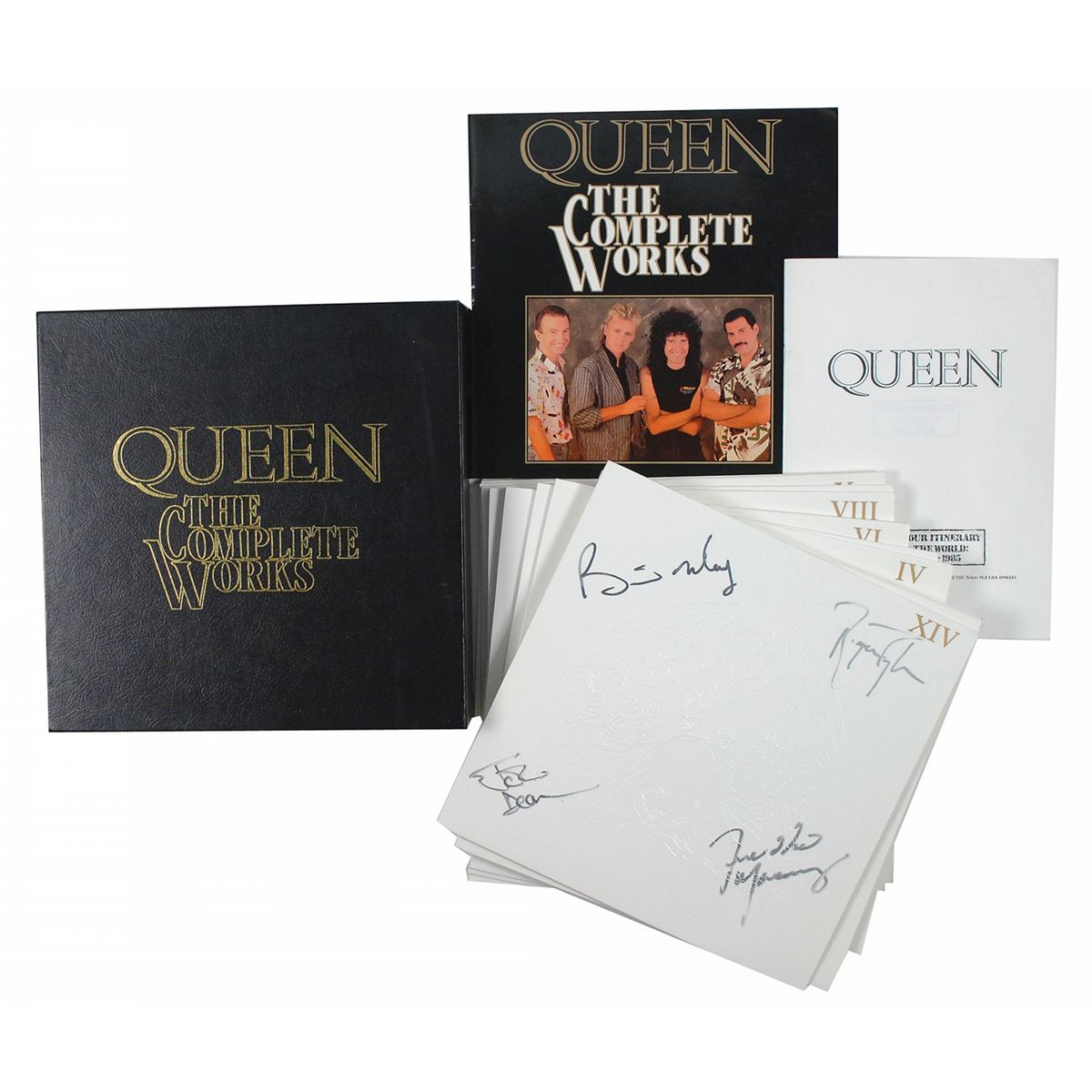 Box set entitled The Complete Works, 12.5 x 12.5, featuring 14 albums that consist of the band’s original studio albums, live album, and non-album tracks, each in an individual white sleeve bearing a gold Roman numeral above the band's embossed crest, signed on album XIV in silver ink by Freddie Mercury, Brian May, Roger Taylor, and John Deacon. Encased in a black box with gold lettering, the set also includes a color accompanying booklet, featuring full color images of the members and each album; an itinerary program for their 1971–1985 World Tour; and a fold-out map of the world, with the locations Queen had toured colored in red. In fine condition. Issued in 1985 after their astronomically successful performance at Live Aid, Parlophone Records compiled the bands studio albums, their Live Killers album, and a disc containing all the A-sides and B-sides that never made it onto the albums, aptly entitled Complete Vision. One of just 600 signed editions released, this complete box set is the definitive Queen collection.