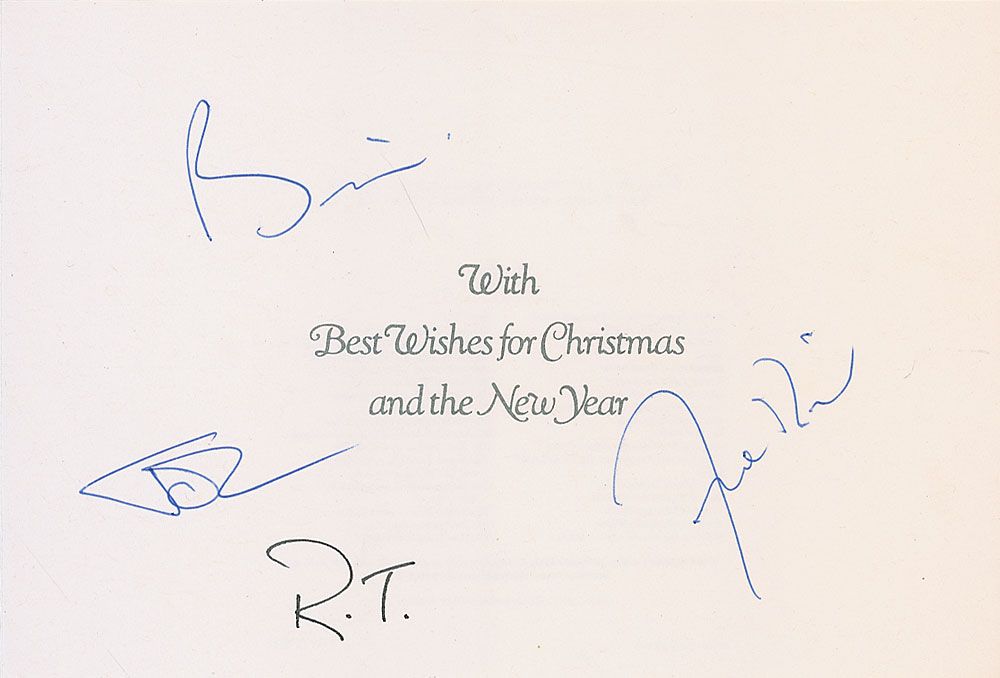 Christmas card sent by the band to their longtime friend and publicist Bryn Bridenthal, 7.5 x 5 closed, with a pre-printed sentiment inside and signed in blue ink, “Freddie,” “Brian,” and “John,” and in black ink, “R. T.” In fine condition, with a light vertical crease to front cover.