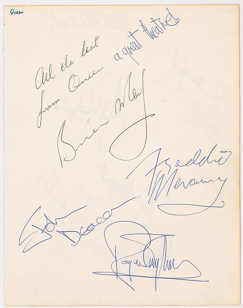 Impressive ballpoint signatures (circa 1974), “All the best from Queen, Brian May,” “Freddie Mercury,” “John Deacon,” and “Roger Taylor,” on an off-white 7.5 x 9.5 theatre guest book page, with “a great theatre,” written above May’s signature. Reverse of the page is signed by the band Argent. In fine condition. Accompanied by a certificate of authenticity from Tracks.