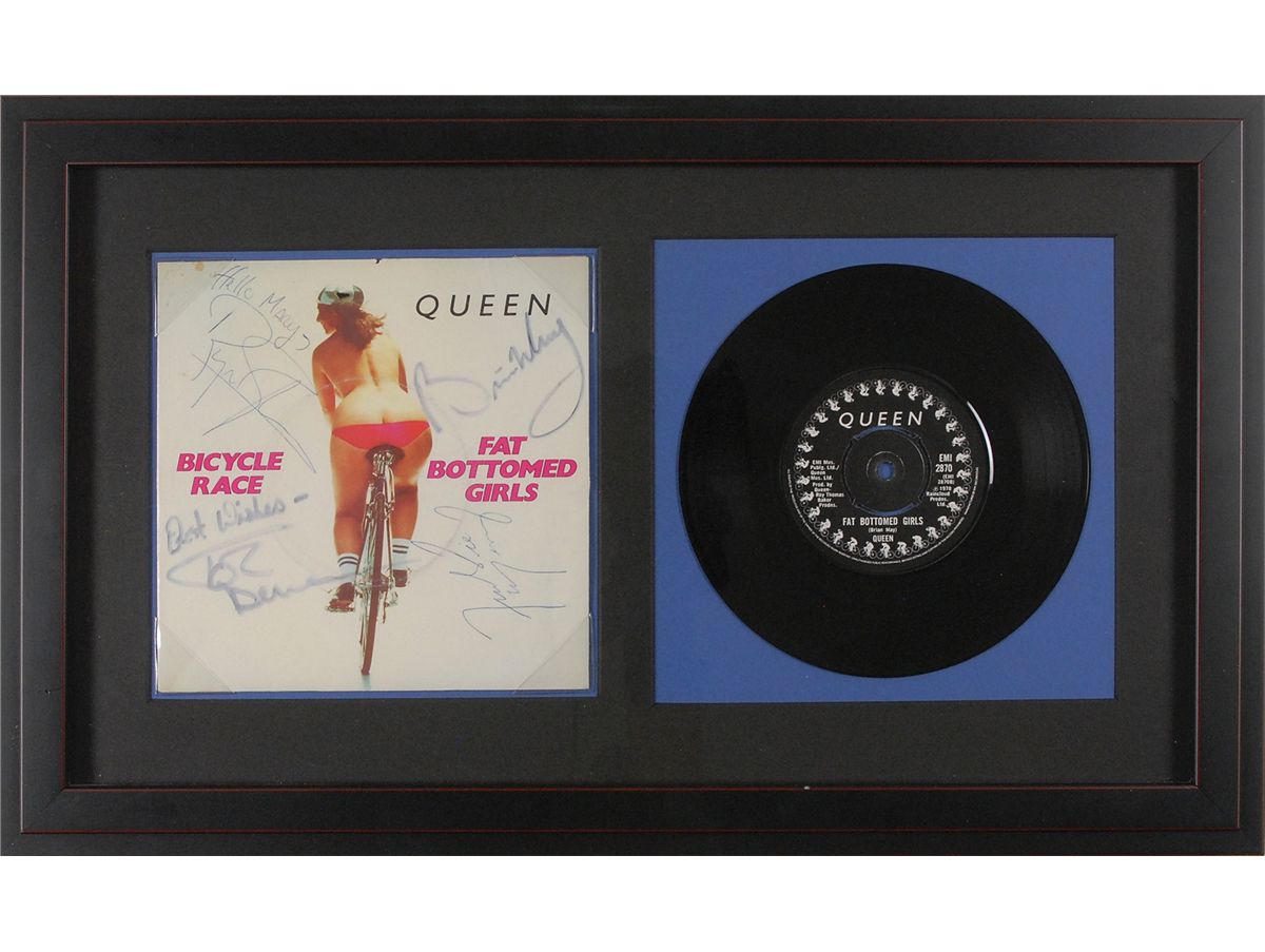 ‘Fat Bottomed Girls/Bicycle Race’ 45 rpm single, signed on the front of the sleeve in blue ballpoint and blue felt tip by Freddie Mercury, John Deacon, Brian May, and Roger Taylor, adding “Hello Mary.” Matted and framed with the record to an overall size of 21 x 12.75. Scattered creasing, a few small spots of soiling to top left corner, and a light album impression to sleeve, otherwise fine condition.