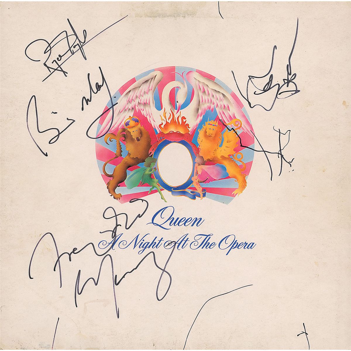 A Night at the Opera album signed on the front cover in black felt tip by Freddie Mercury, Brian May, Roger Taylor, and John Deacon. Deacon’s signature very hurried, stray ink marks to front cover, some corner tip dings, and scattered light toning and soiling, otherwise fine condition. Signatures were originally obtained on May 10, 1977, outside of a hotel in Gothenburg, Sweden. The record is included.