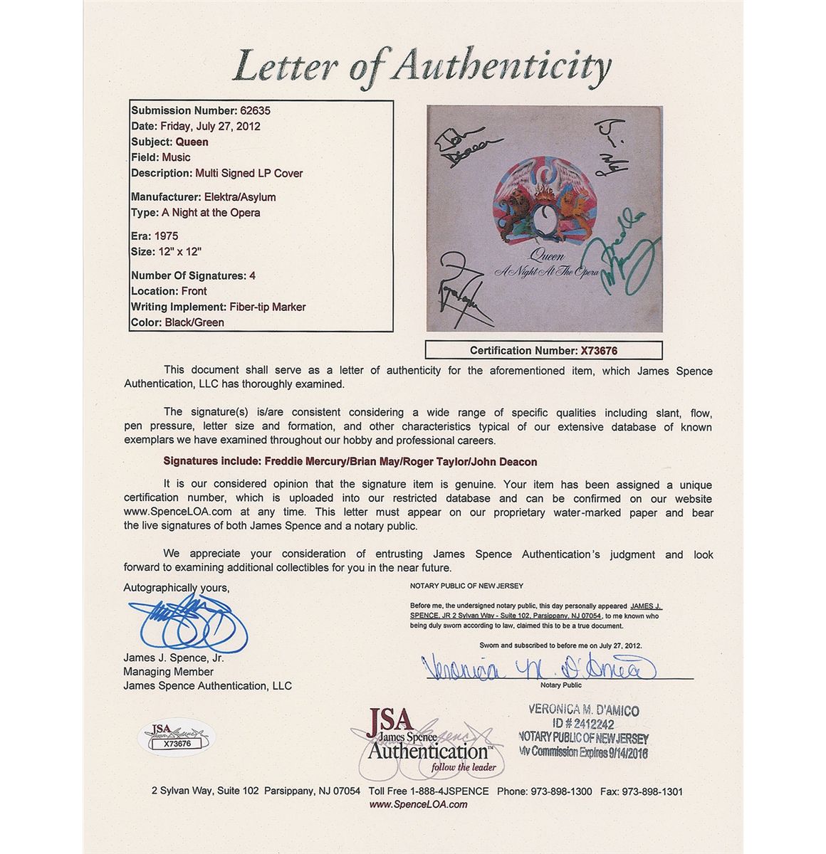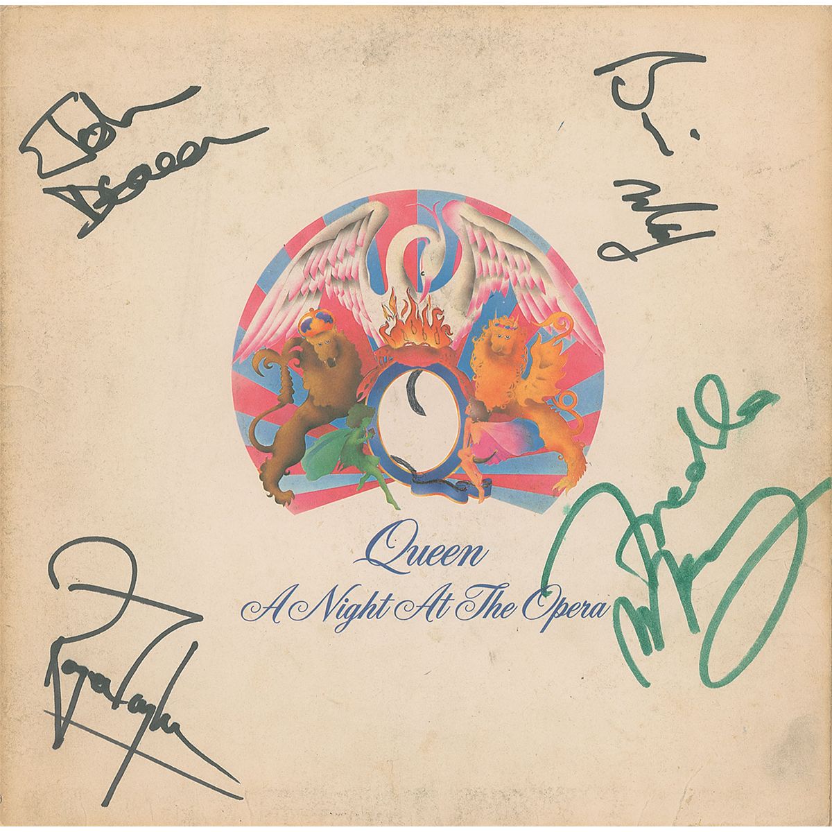 A Night at the Opera album signed on the front cover in green felt tip by Freddie Mercury and in black felt tip by Brian May, Roger Taylor, and John Deacon. In very good condition, with scattered light soiling and edge creases to front cover, and a ‘ring of wear’ and scattered soiling and staining to back cover. The record is not included. At the time of its release, A Night at the Opera was the most expensive album ever recorded. Accompanied by a full letter of authenticity from James Spence.